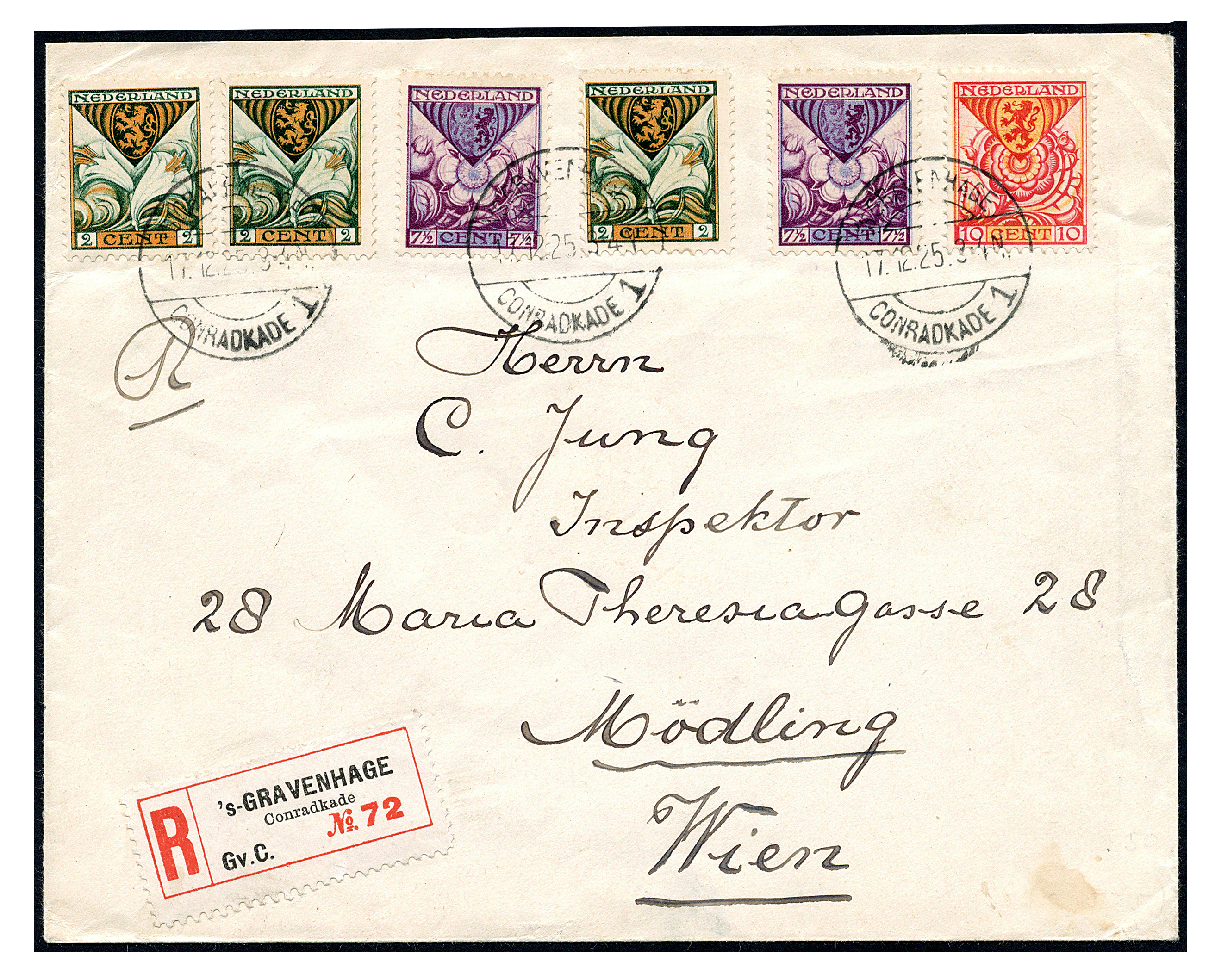 1367 on cover imageKinderzegels 1925 2 cent nr. 166 (3x), 7½ cent nr. 167 (2x) en 10 cent nr. 168 op envelop van 'sGravenhage / Conradcade 1 op 17-12-1925 aangetekend naar Wenen (Image)