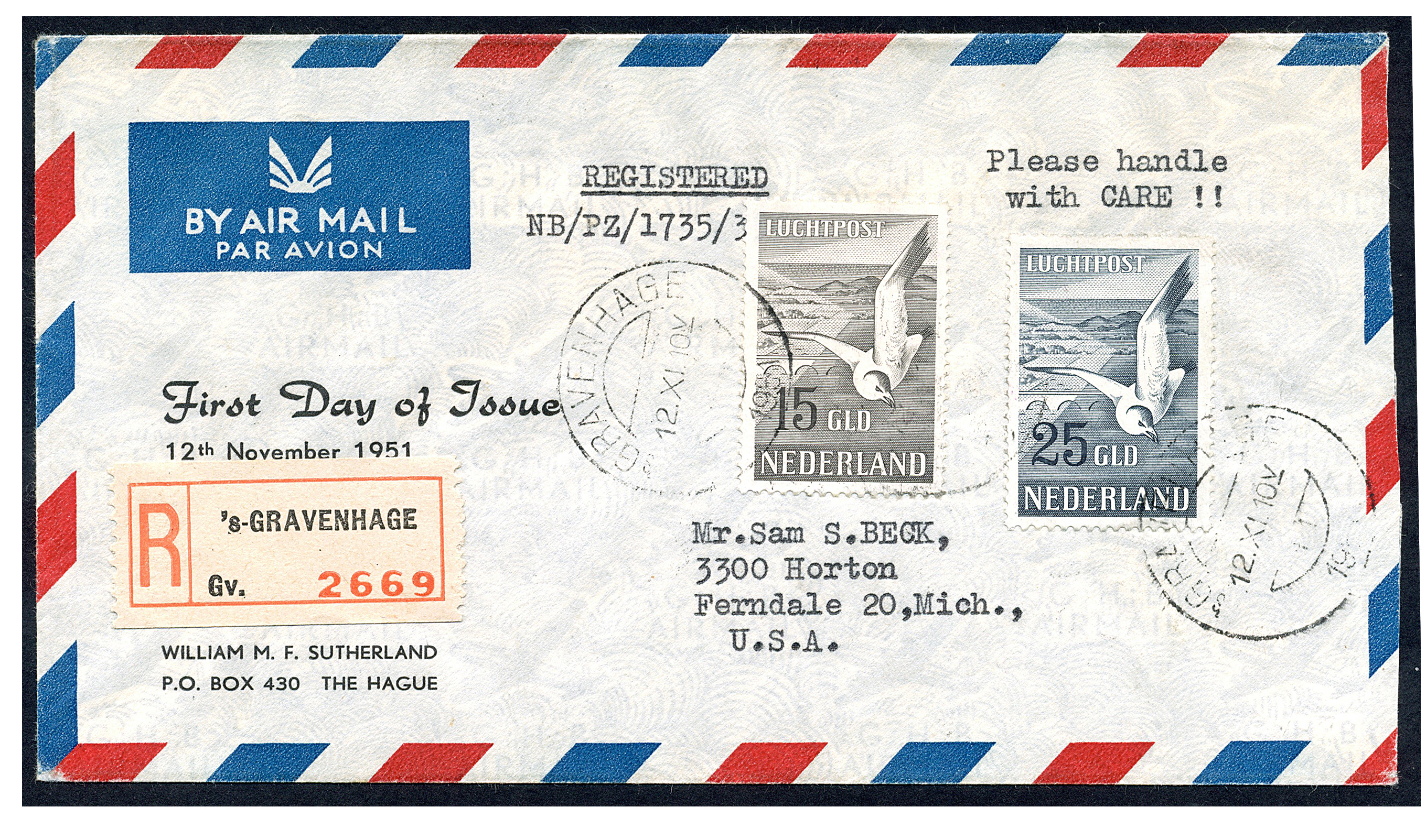 1368 on cover imageLP12/13, Zeemeeuwen op speciale eerste dag-envelop van William M.F. Sutherland met afstempeling 'sGravenhage 12-11-1951, aangetekend naar Detroit/Ferndale in de U.S.A. 15-11-1951. Zeer zeldzame FDC, volgens HPN D6-9 'Er zijn enkele enveloppen bekend met de beide zegels gebruikt op de dag van uitgifte.' (Image)
