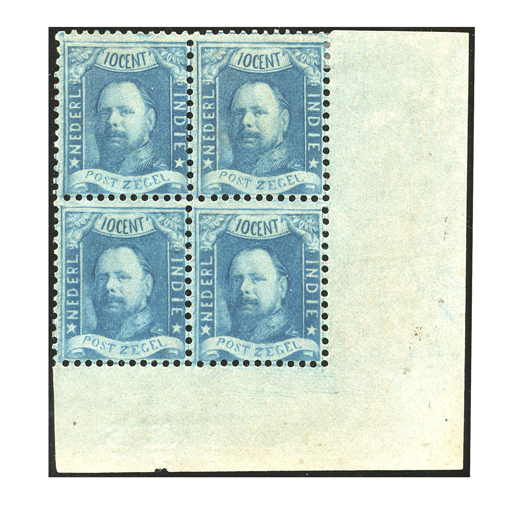 1369 (og) imagePC.5, 10 cent blauw, proef in kt. 12½ : 12, zonder gom (az. bruine strepen van de oorspronkelijke gom nog zichtbaar), in prachtig, fris hoekblok van vier. Waarschijnlijk het enige bekende blok van vier met hoekvelranden! Attest Vleeming (2017). [Fl. 2000] (Image)