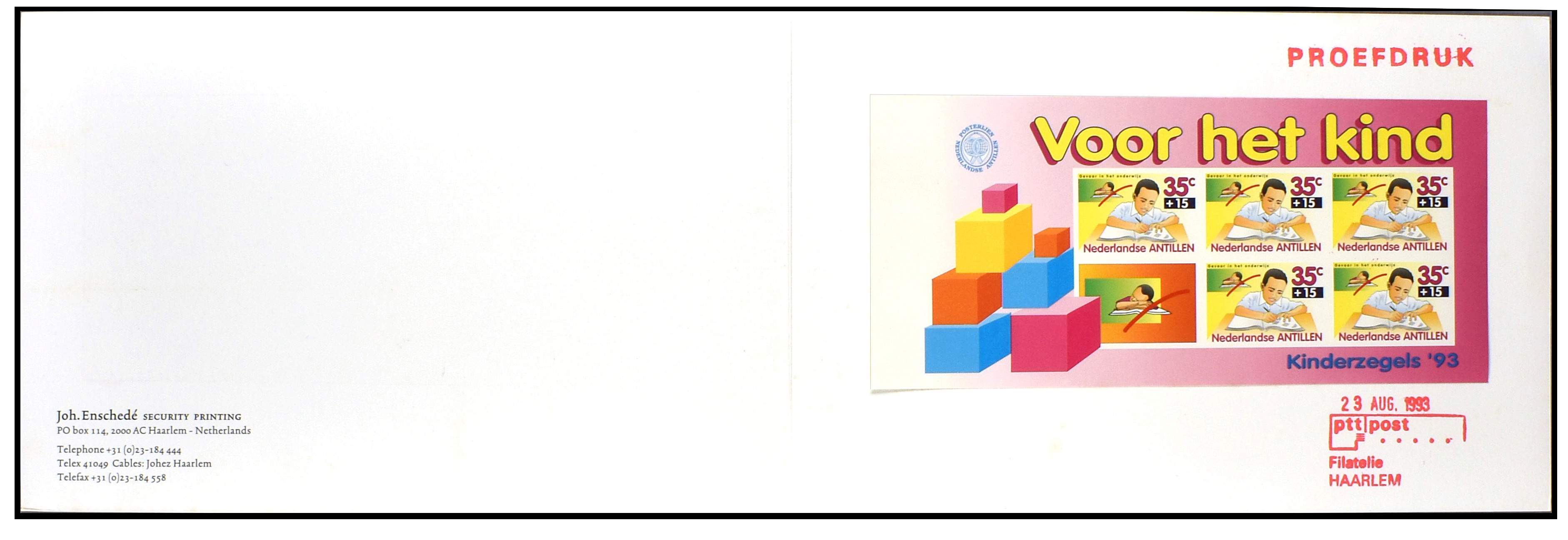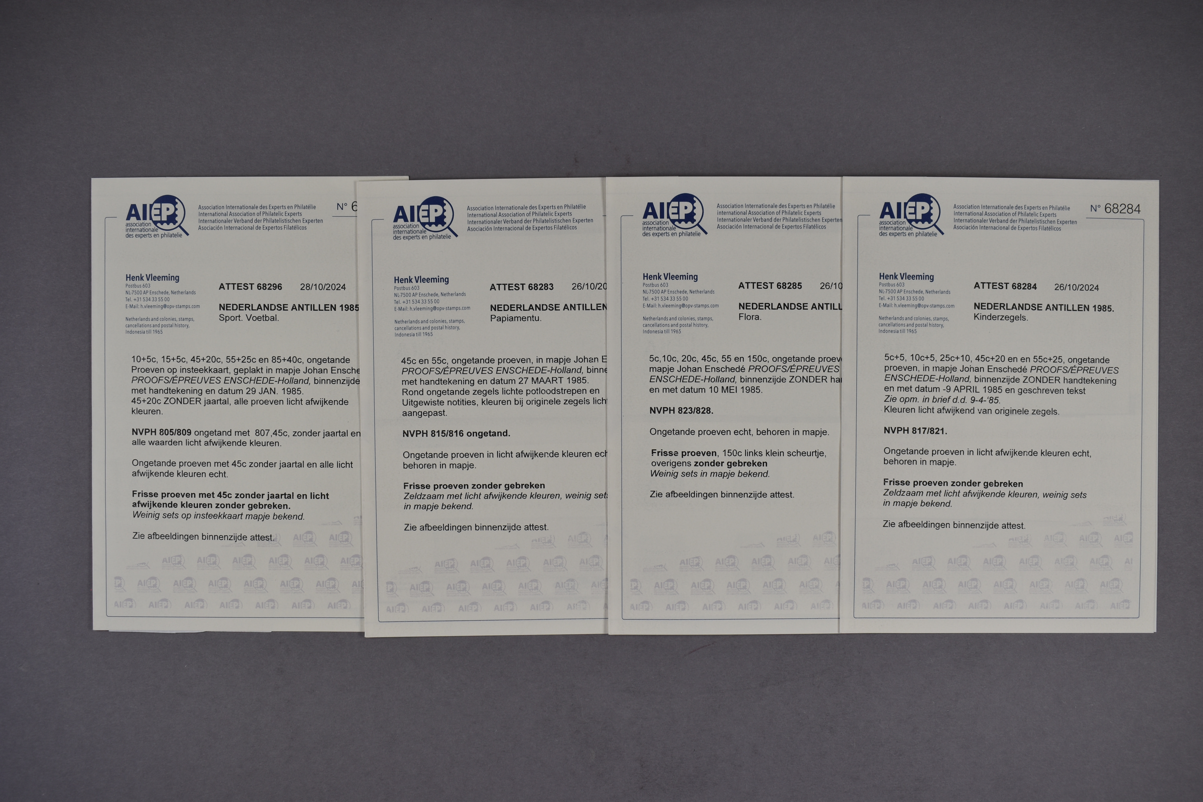 1400 (og) image1985, NVPH-nrs. 805/09, 815/16, 817/21 en 823/28, Voetbal, Papiamento, Kinderzegels en Flora, ongetande proeven, elke serie in mapje van Joh. Enschede, alle in licht afwijkende druk en kleuren en alle met certificaat Vleeming (2024) (Image) (Image2)