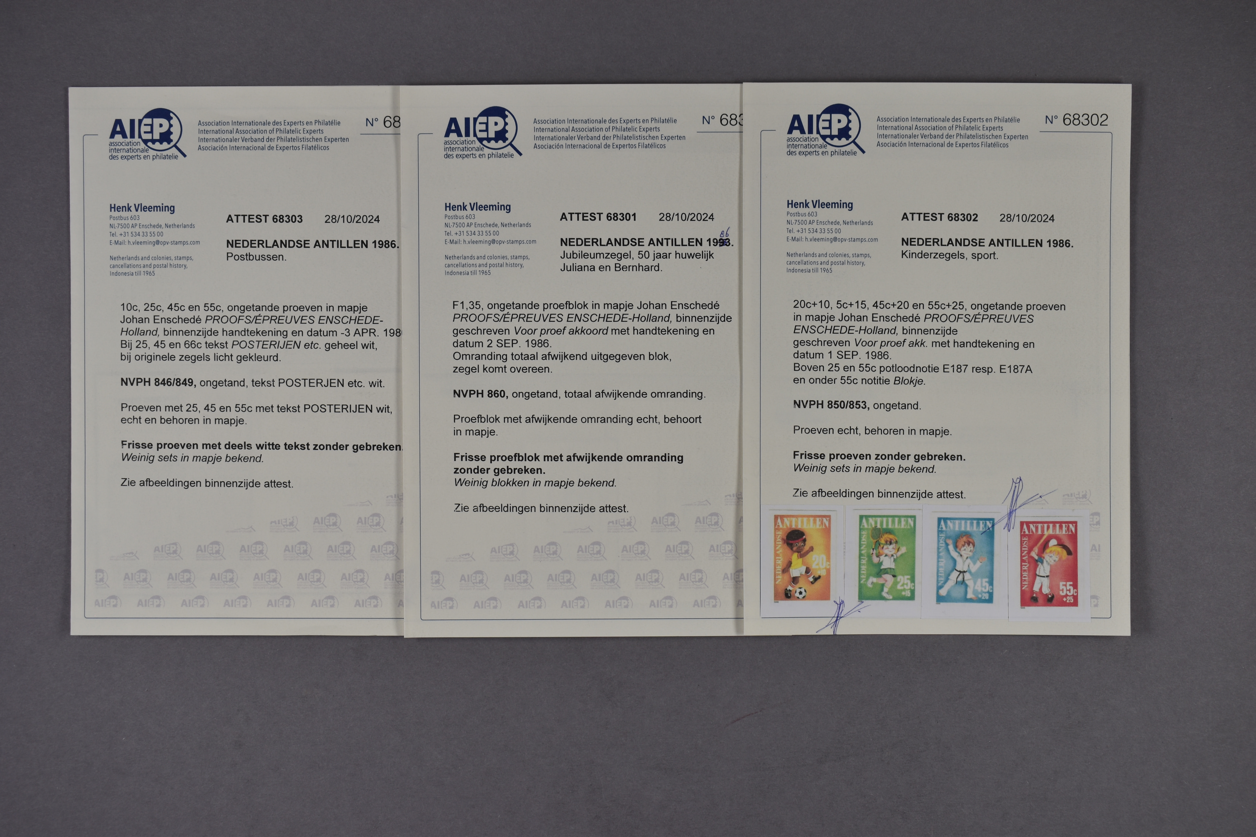 1401 (og) image1986, NVPH-nrs. 846/49, 850/53 en blokje 860, Postbussen, Kinderzegels en 50-jarig huwelijk Juliana en Bernhard, ongetande proeven, elk in mapje van Joh. Enschede in licht afwijkende druk en kleuren. Zeldzame prachtex., alle met certificaat Vleeming (2024) (Image) (Image2)