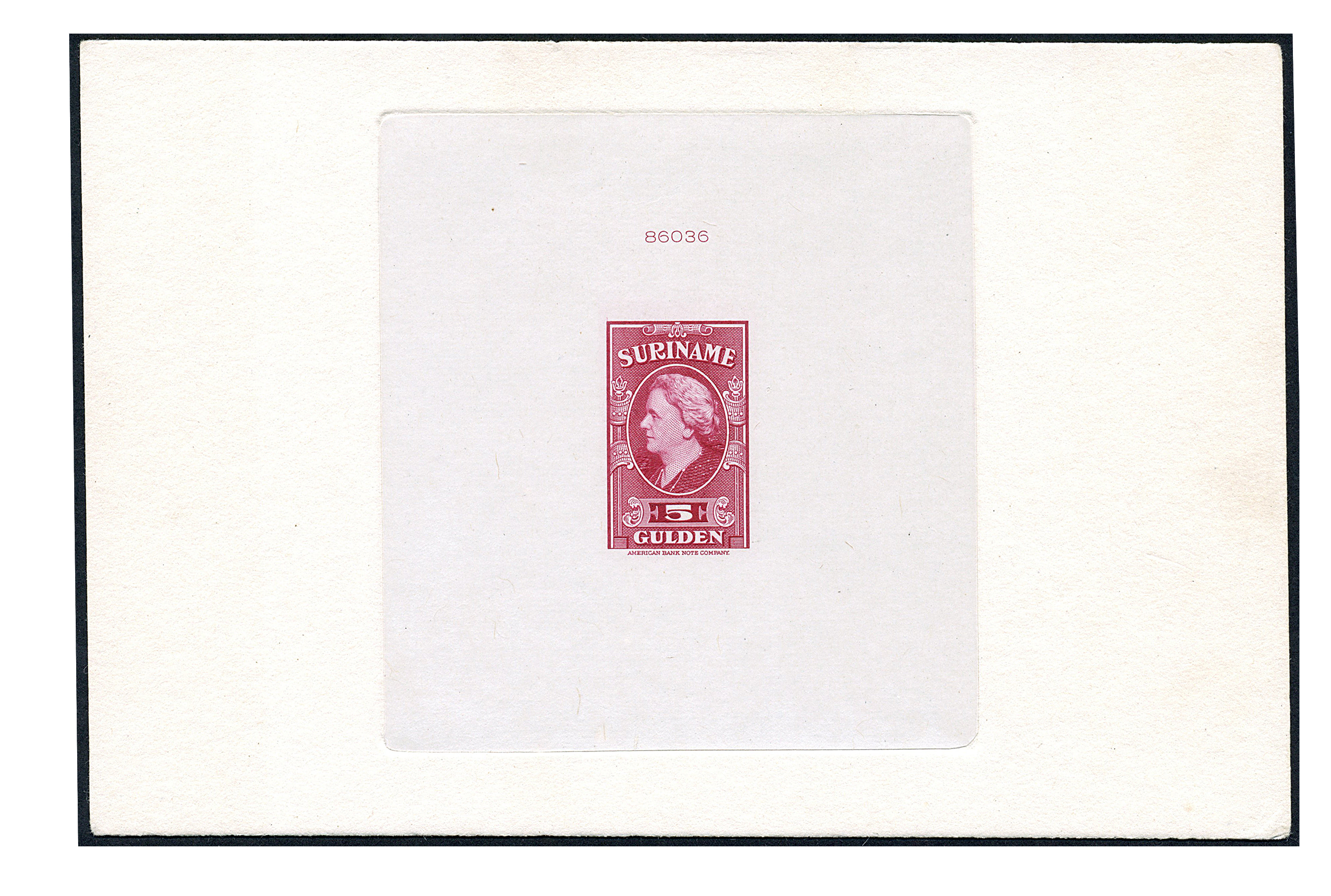 1406 (og) imagePC96, Stempelproef van de 5 Gulden karmijn, ongetand in velletje op kartonnetje met opstaande randen. Hfl. -,- (Image)