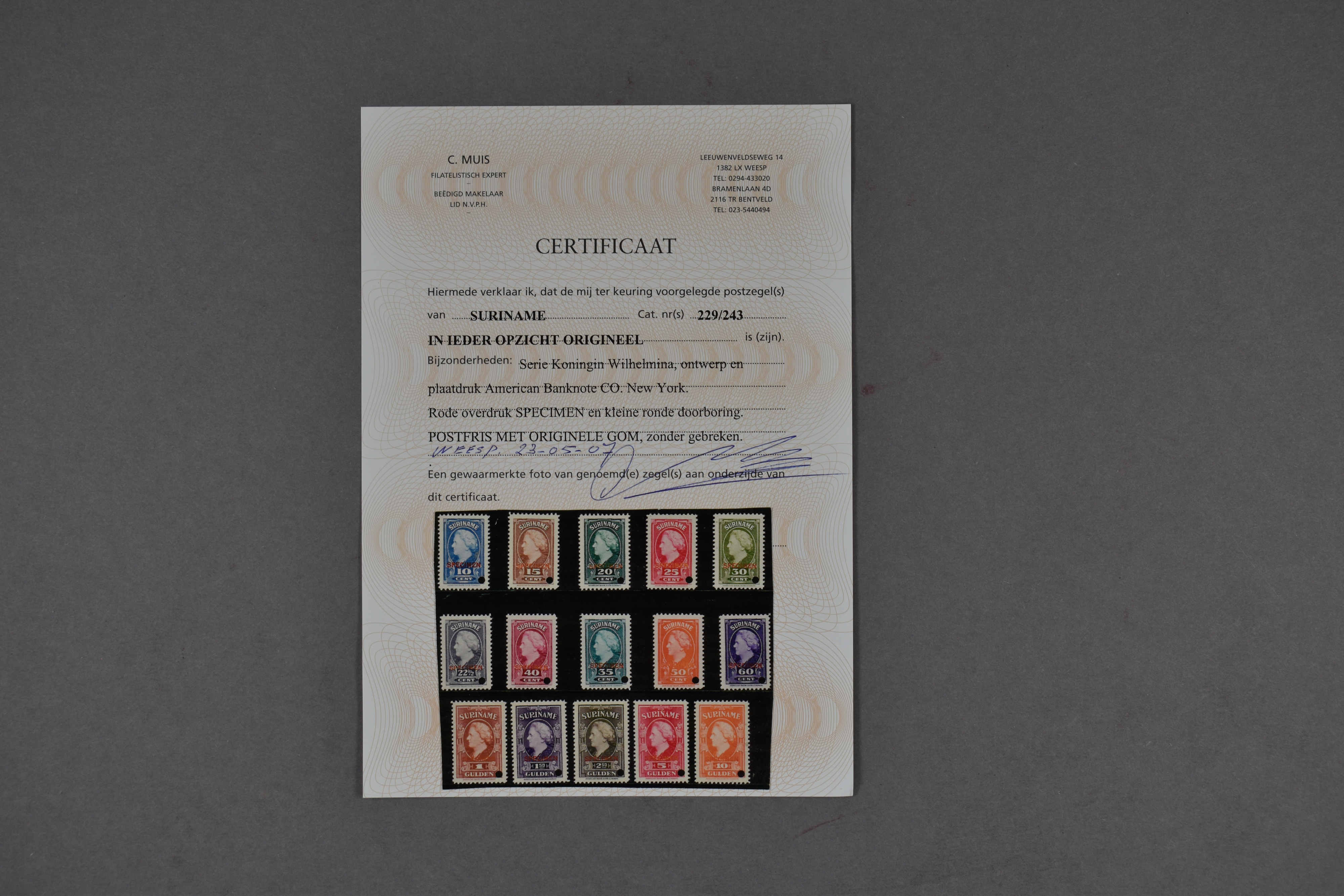 1407 nh image229/43, Koningin Wilhelmina 1945, postfrisse prachtserie met rode opdruk SPECIMEN en perforatiegat. Slechts 300 series bekend. Cert. Muis (2007). € 1500 (Image) (Image2) (Image3)