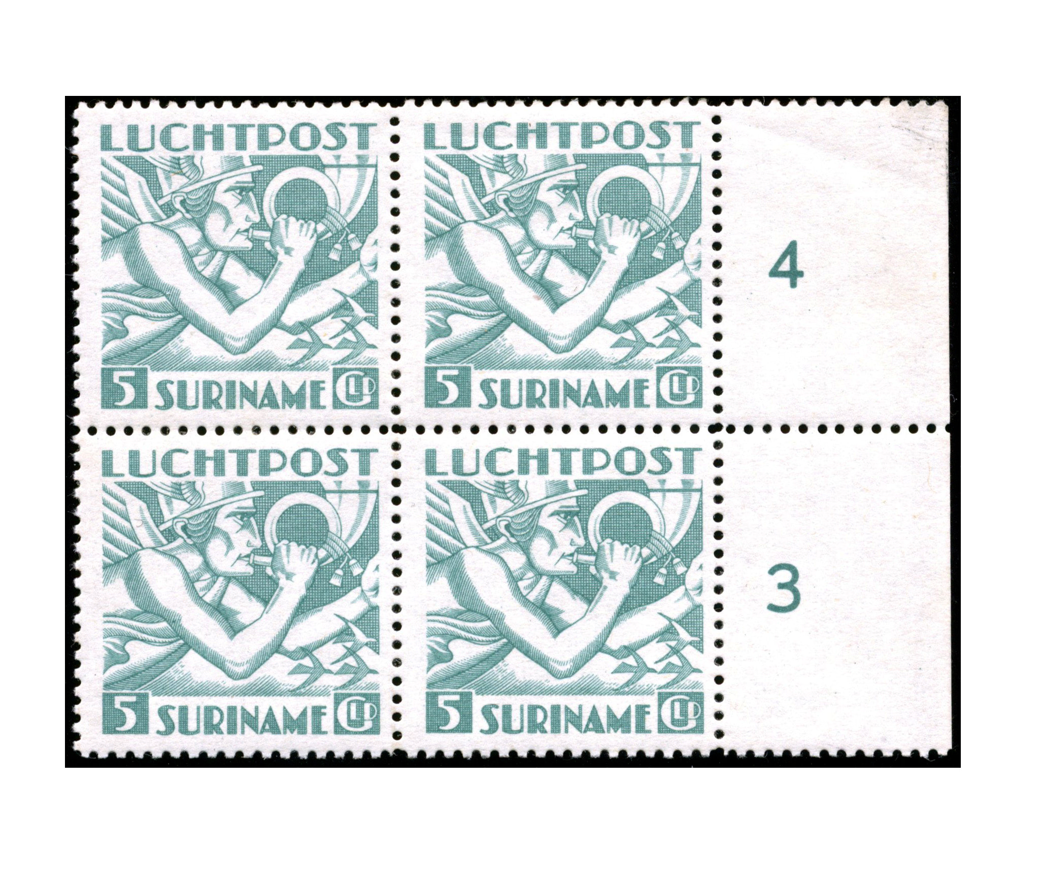 1409 nh imageLP18. 5 gulden blauwgroen in postfris randblok van vier met kenmerkende iets verkleurde gom € 1600 (Image)