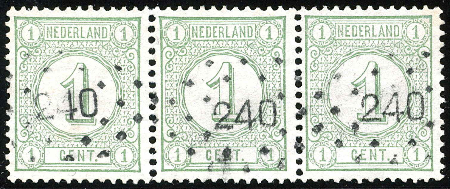 240 = Akkrum op 1 cent nr. 31. Prachtstrip met op iedere zegel een mooie afst. (Image)