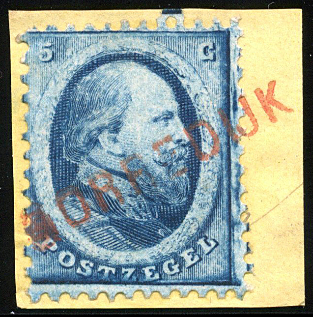 VENRAAI (of: VENRAY) met schreefletters in zwart op 5 cent nr. 4. Prachtex. met groot deel van dit naamstempel. Gecatalogiseerd als Venray, in PEP1 op p.237 een afbeelding van nr. 4 waarop Venraai. Van Unen € 100 (Image)