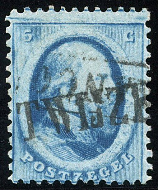 TWIJZEL met schreefletters in zwart op 5 cent nr. 4. Prachtex. met vrijwel volledige afst. en tevens Franco in kader. Mogelijk unieke afstempeling van dit bestelhuis op deze zegel! Nog niet gecatalogiseerd. Zie van Unen, p.108 (Image)