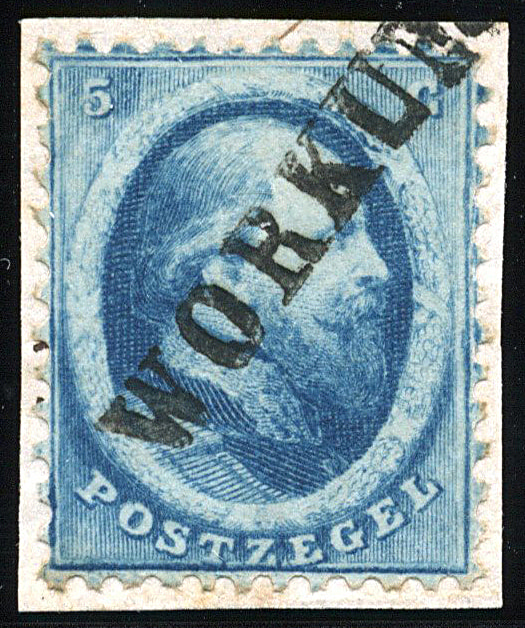 WORKUM met schreefletters in zwart op 5 cent nr. 4. Prachtex. op briefstukje met ideale afst. Van Unen € 100 (Image)