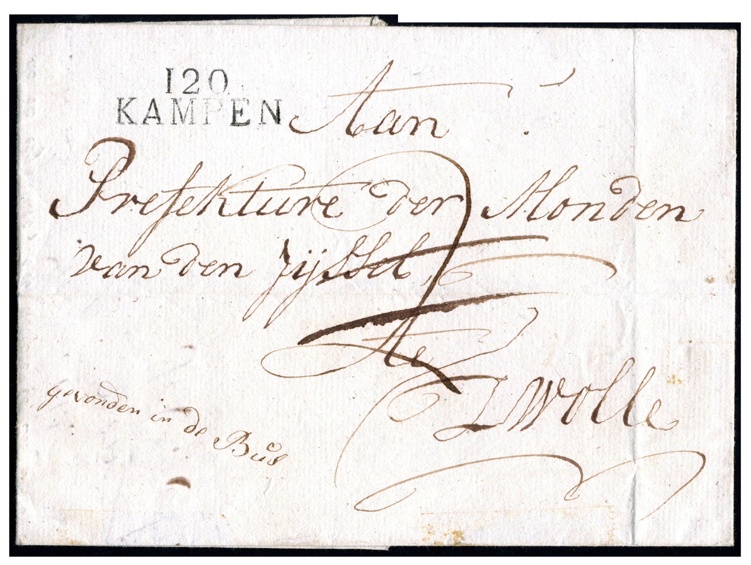 1561 on cover imageDepartementsstempels. '120 / KAMPEN' in zwart (PEP1.7160-03), prachtige afstempeling op gedeeltelijk bedrukte, gerepareerde brief van 26-7-1811 naar Zwolle, met linksonder geschreven 'gevonden in de Bus' (Image)