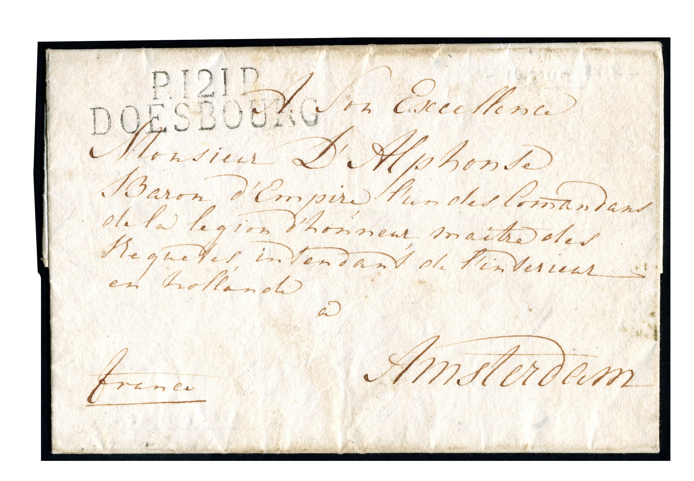 1562 on cover imageDepartementsstempels. 'P.121.P. / DOESBOURG' in zwart (PEP1.2140-03), mooie, scherpe afstempeling op het landgoed 'Wildbaan' 16-6-1812 naar een baron te Amsterdam. Tevens '121 / DOESBOURG' in zwart op een frisse, complete brief van 9-11-1812 naar Hummelo, met op de vz. geschreven 'le Receveur en l' enrégisterement et des Domaines à Doesborgh' + handtekening (Image)