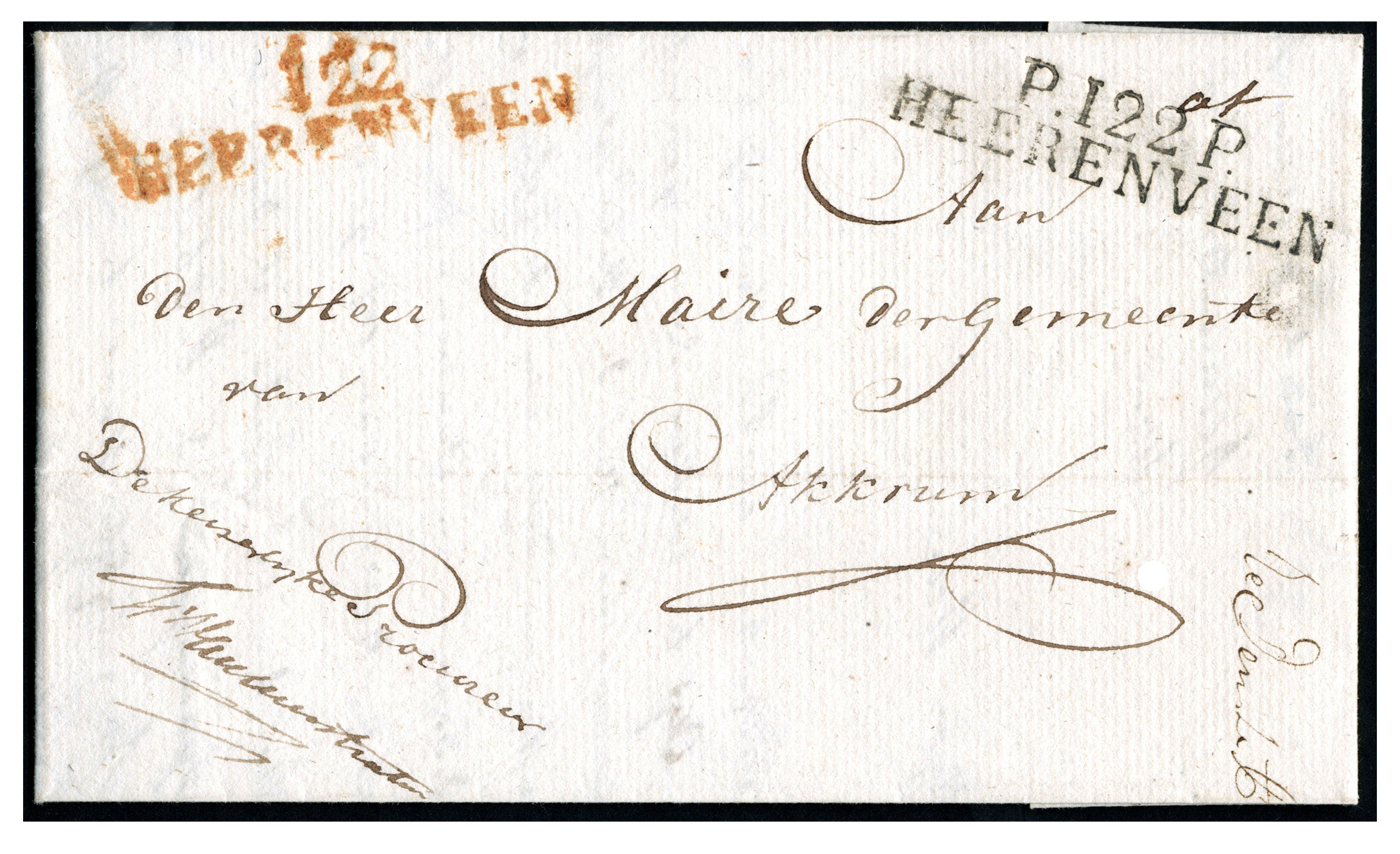 1565 on cover imageDepartementsstempels. Zeer frisse brief geschreven op 3-2-1813 in Heerenveen door de Keizerlijke Procureur naar de 'Maire' van de gemeente Akkrum. De brief is een ambtelijk stuk, dus portvrij, maar per abuis afgest. met 122/HEERENVEEN in rood wat aangeeft dat de ontvanger port moet betalen, daarna gecorrigeerd met P.122 P./HEERENVEEN in zwart (port betaald). Prachtbrief! (Image)