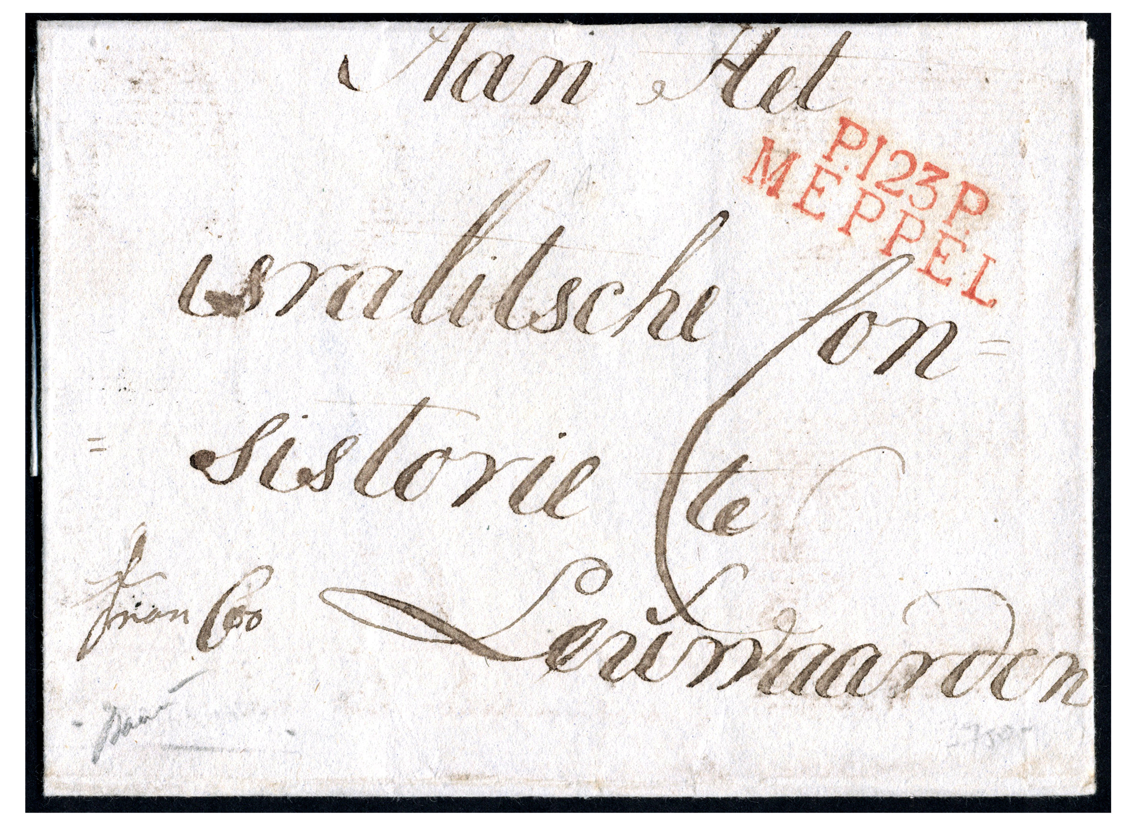 1566 on cover imageDepartementsstempels. 'P.123 P. / MEPPEL' in rood (PEP1.0120-02), luxe afstempeling op brief geschreven te Dwingelo op 20-9-1813, naar 'Leuwaarden'. Zeldzaam. Keur Baudot (Image)