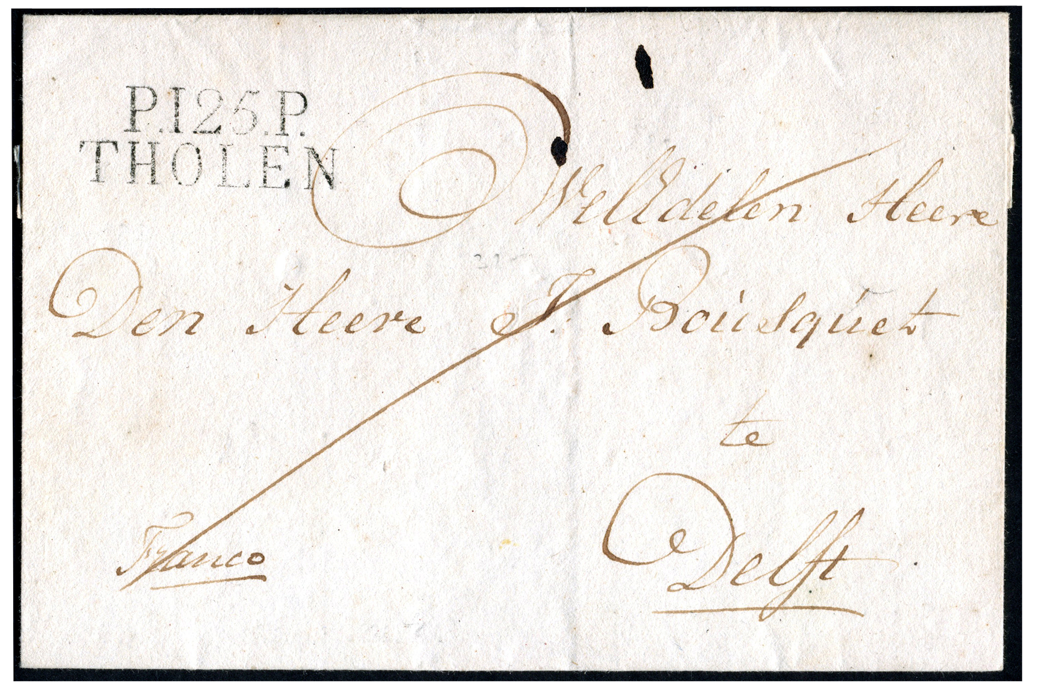 1567 on cover imageDepartementsstempels. 'P.125.P. / THOLEN' in zwart (PEP1.9220-05), luxe afstempeling op zeer frisse, ongedateerde, dichtgeplakte briefomslag naar Delft (Image)