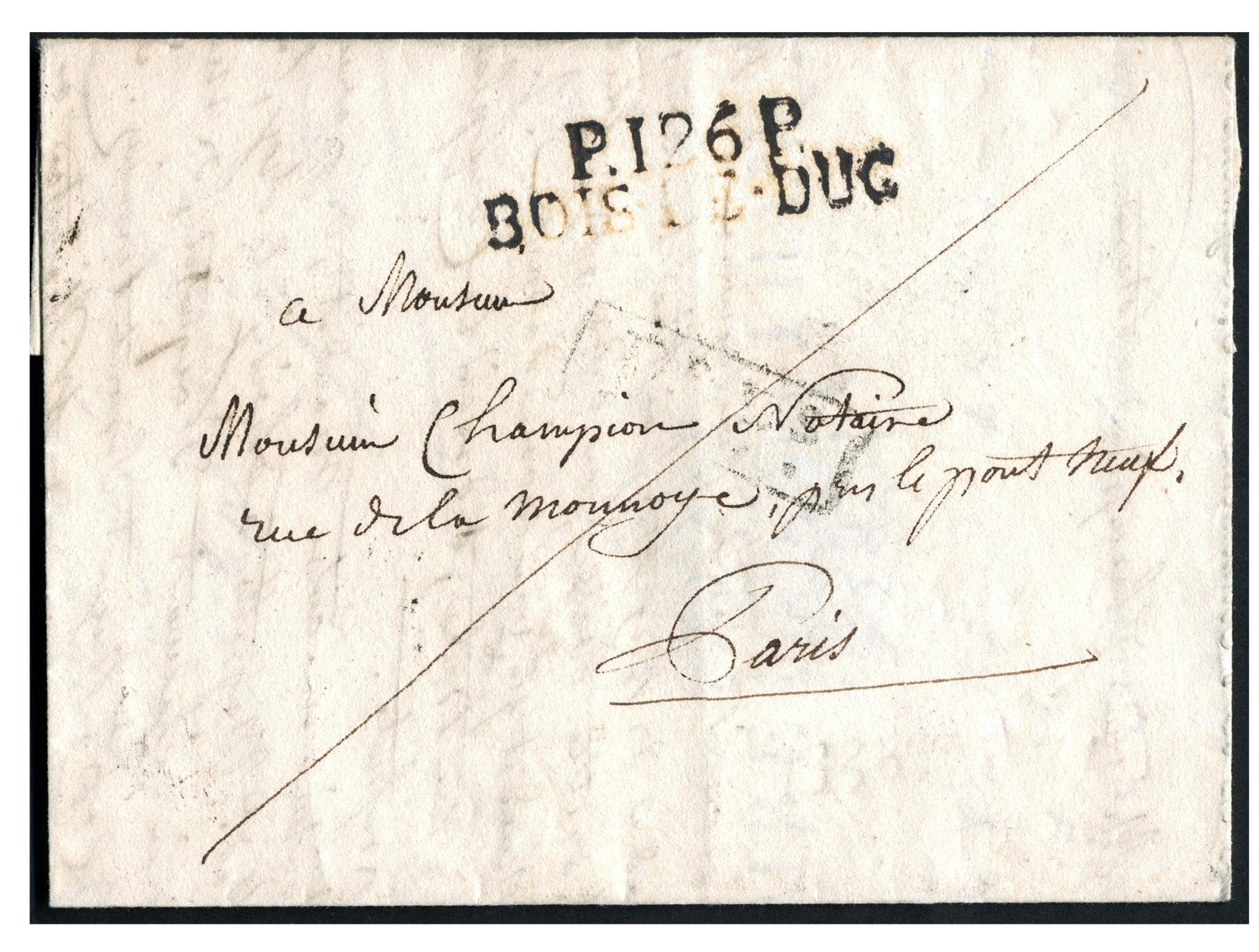 1568 on cover imageDepartementsstempels. 'P.126 P. / BOIS-LE-DUC' in zwart (PEP1.5190-08), mooie afstempeling op deels met het Franse wapen bedrukte brief op 8-3-1813 naar Parijs 12-3-1813, met op vz. P.s.P.s. in kader. Cert. Roumet (2017) (Image)