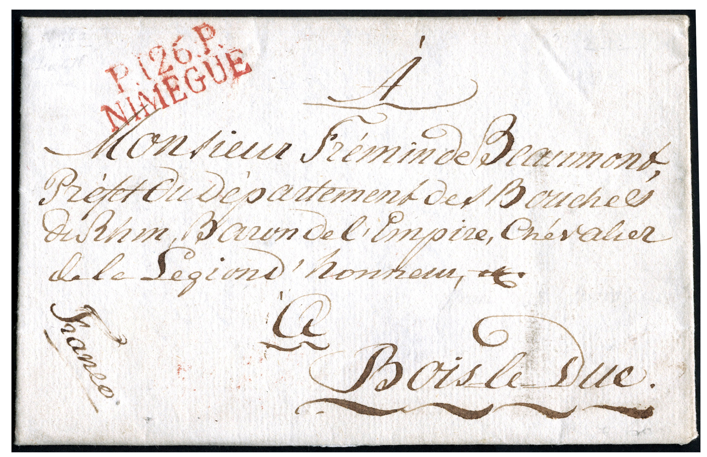 1569 on cover imageDepartementsstempels. 'P.126.P. / NIMEGUE' in rood (PEP1.2370-06), luxe afstempeling op zeer frisse brief geschreven te Druten 23-2-1812 naar Bois-Le-Duc (Image)