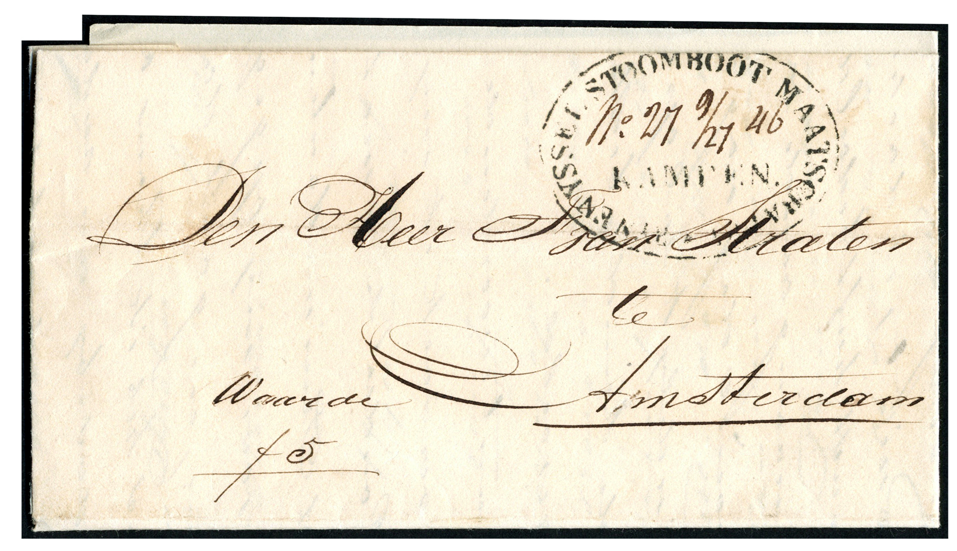 1570 o imageStoomboot. Ovaalstempel RYN EN YSSEL STOOMBOOT MAATSCHAPPY / KAMPEN waarin geschreven 'No. 27 9/27 46' (PEP2.S394) op een brief waarop geschreven 'Waarde f 5', van Kampen 27-9-1846 naar Amsterdam (Image)