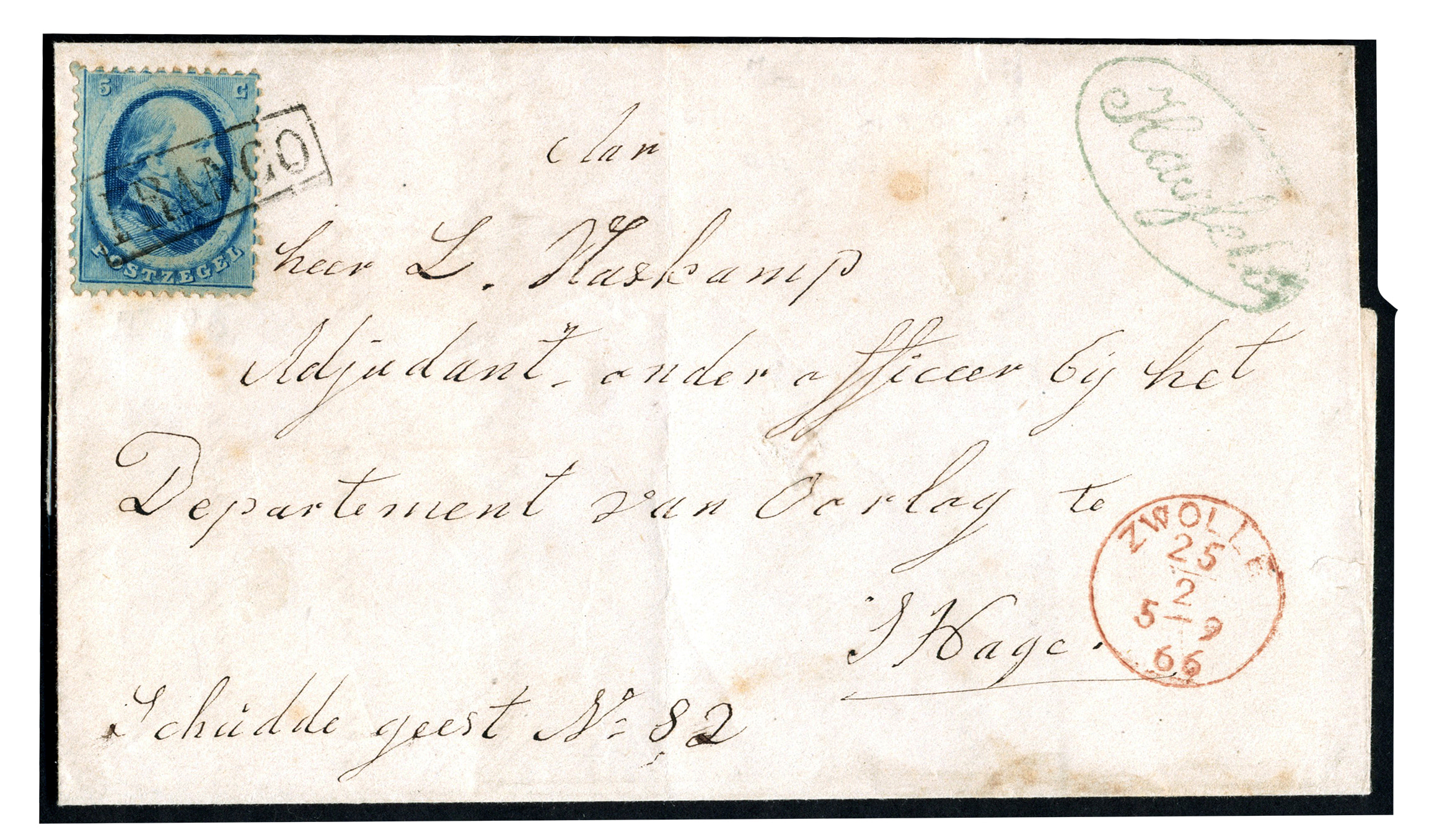 1571 on cover imageMILITAIR TARIEF. 5 Cent nr. 4A prachtex. op halve brief, afgestempeld op het hulppostkantoor Hasselt (naamstempel in ovaal, groenblauw, PEP1.7120-02) via Zwolle 25-2-1866 (proefstempel, klein model uurstempel PEP1.7330-22) naar L. Vlaskamp, 'Adjudant onderofficier bij het Departement van Oorlog', adres Schuddegeest No. 82 (Schuddegeest is een hofje in de Haagse Archipelbuurt) te 'sGravenhage 26-2-1866, met op az. tevens bestellersstempel C 7 in ovaal. Het normale brieftarief is 10 cent (afstand meer dan 30 km), omdat deze brief is gericht aan een onderofficier is het militair brieftarief toegepast, 5 cent voor brieven tot 15 wigtjes. De brief is geschreven door 'uw toegenegen Broer en zuster Geriet Zandkamp en Willemien Vlaskamp, ik hoop dat u deze regelen in gezondheid zult ontvangen wij mogen ons er volkomen in verheugen'. Gerrit Zandkamp en Willemien Vlaskamp zijn te Hasselt op 9-2-1866 in het huwelijk getreden. Uiterst zeldzaam poststuk! Literatuur: Marc Snoeren. 'Een bijzonder zeldzaam, of een zeldzaam bijzonder tarief€' De Postzak nr. 231 (2022), afbeelding en beschrijving van dit poststuk op p.61. Waarschijnlijk slechts 2 brieven bekend!! Tentoonstellingsstuk (Image)