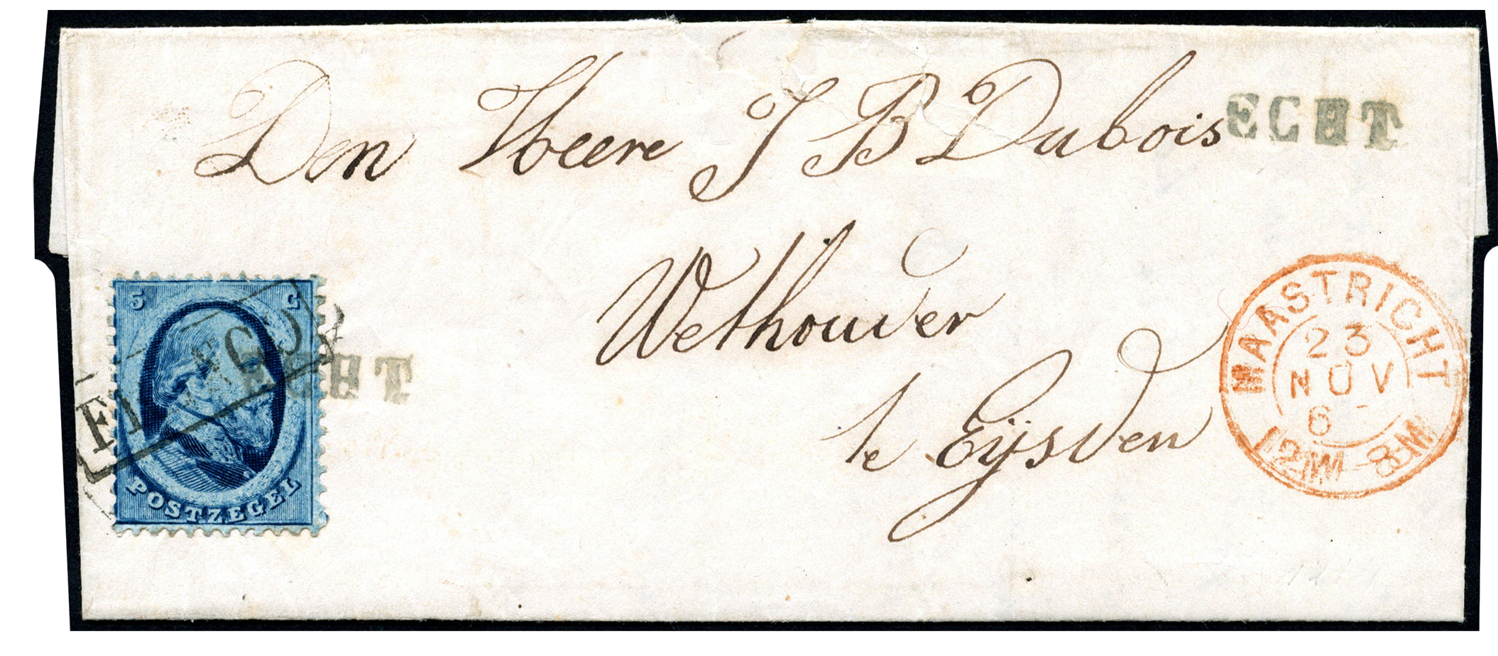 1573 on cover imageNaamstempels. 5 Cent nr. 4B, prachtex. op frisse, complete brief te Echt op 23-11-1867 geschreven, 2x afgestempeld ECHT (type met schreven, in zwart), over Maastricht 23-11-1867 naar een wethouder te Eijsden (Image)