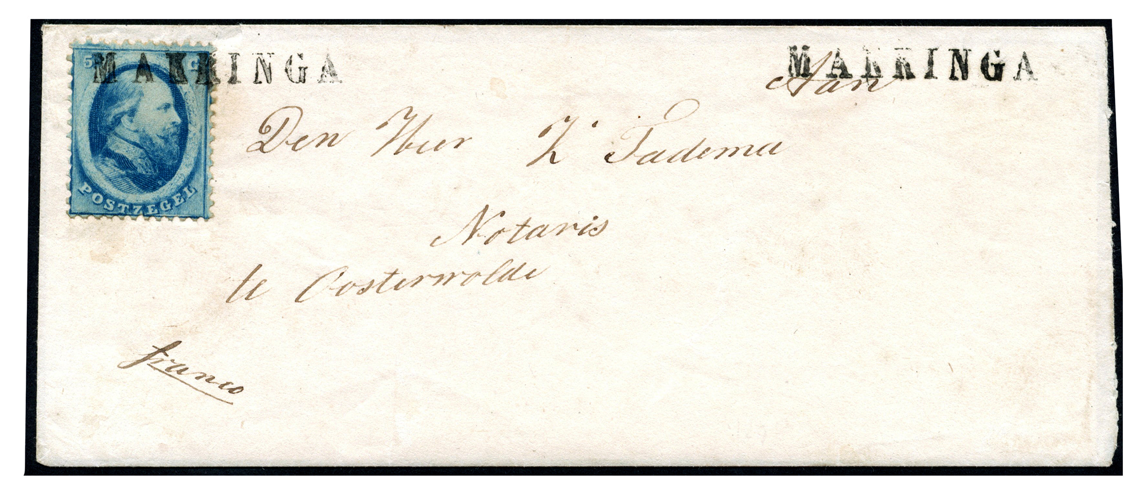 1574 on cover imageNaamstempels. 5 Cent nr. 4A op ongedateerde envelop, 2x afgestempeld MAKKINGA (type met schreven, in zwart), zonder tussenkomst van een postkantoor naar notaris K. Tadema te Oosterwolde. Zie Cleij p.155-156 (Image)