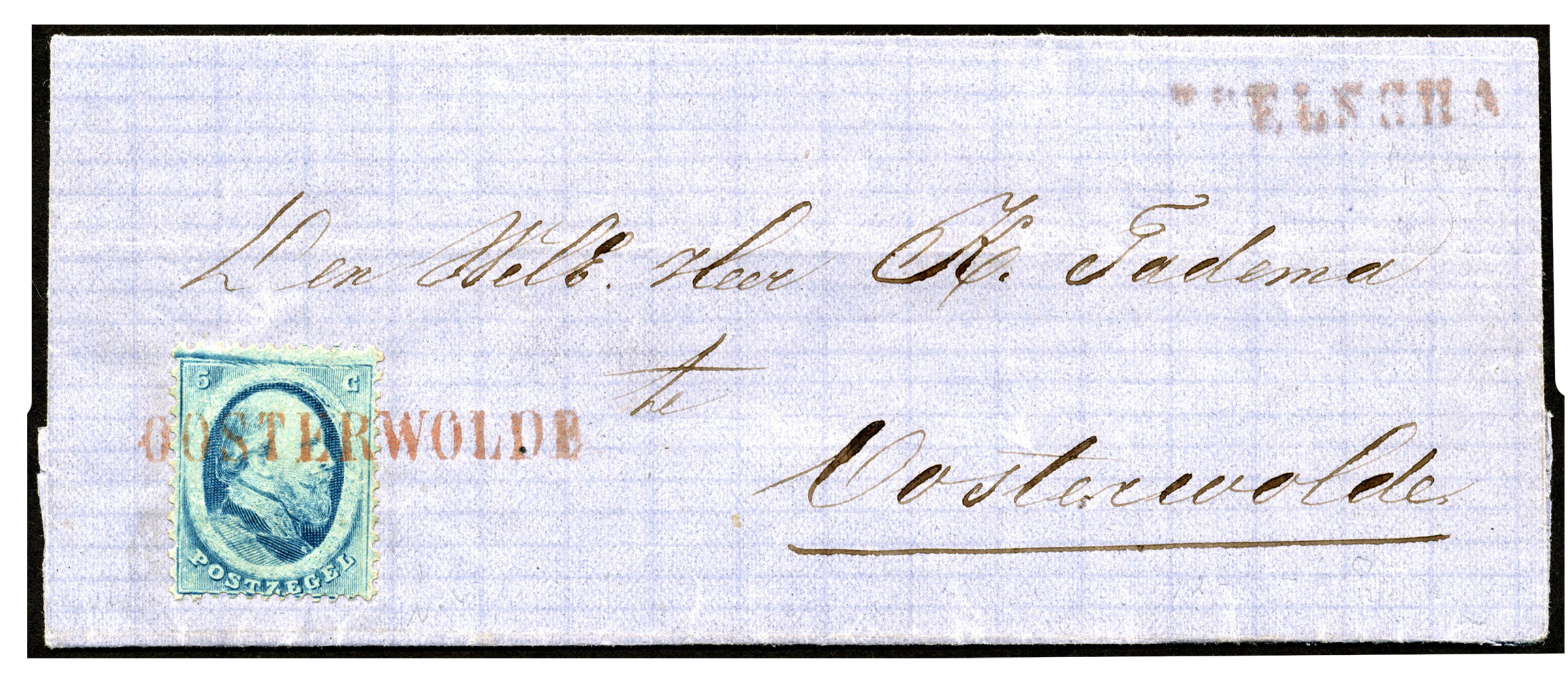 1575 on cover imageNaamstempels. 5 Cent nr. 4B op frisse, complete brief geschreven te Appelscha 12-2-1868, afgestempeld rechtsboven APPELSCHA (type met schreven, in rood), zonder tussenkomst van een postkantoor naar OOSTERWOLDE, waar de zegel alsnog werd afgestempeld, wat in Appelscha werd nagelaten. Cert. Holcombe (1996) (Image)