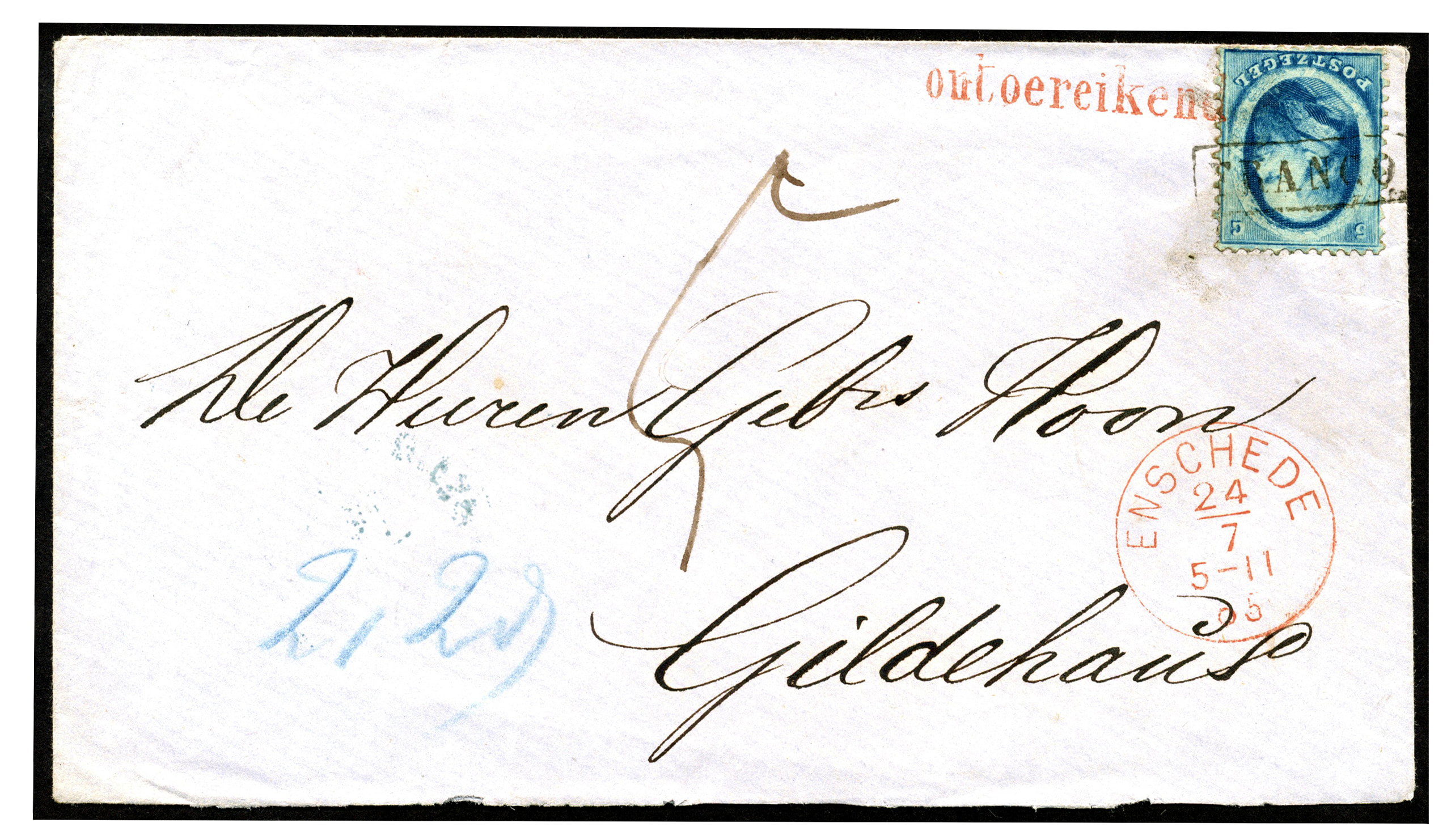 1579 on cover imageOntoereikend. 5 Cent nr. 4A, prachtex. op envelop van Enschede 24-7-1865 (superbe afst.) naar Gildehaus (D) 25-7, ontoereikend (K.131a in rood) gefrankeerd omdat Gildehaus in rayon 1 ligt waar, omdat de afstand meer dan 30 km is, het tarief sedert 1-8-1865 10 cent bedraagt. Tevens 5 cent nr. 4A op deels gedrukte brief van Alkmaar 18-1-1865 naar Utrecht 19-1-1865 met geschreven 'ontoereikend' (K.130) (Image)