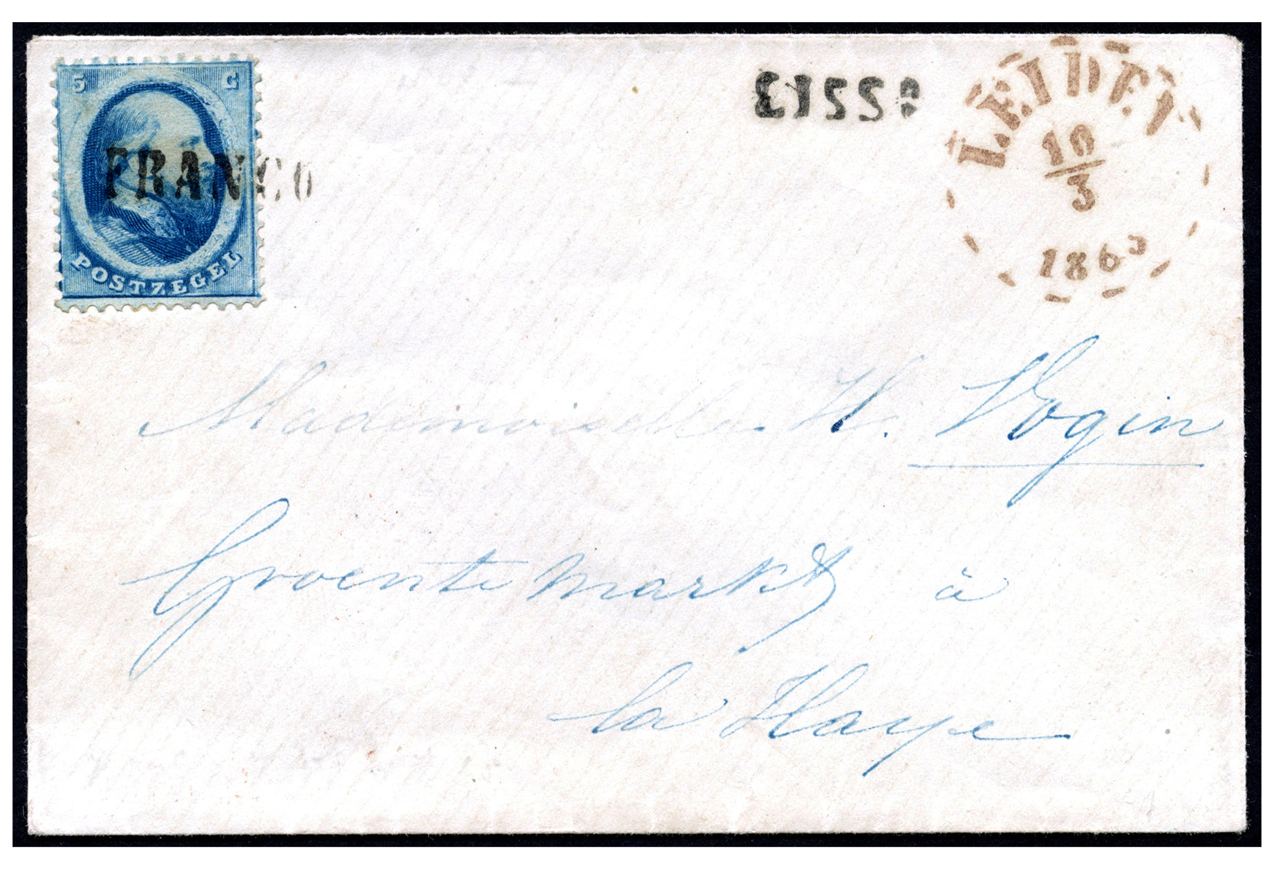 1580 on cover imageSpoorwegen. 5 Cent nr. 4A, prachtex. afgestempeld met FRANCO zonder kader, op frisse envelop van het hulppostkantoor LISSE waar de brief met het naamstempel in zwart en het gebroken cirkelstempel Leiden 10-3-1865 in rood is afgestempeld, naar 'sGravenhage 10-3-1865 (Image)
