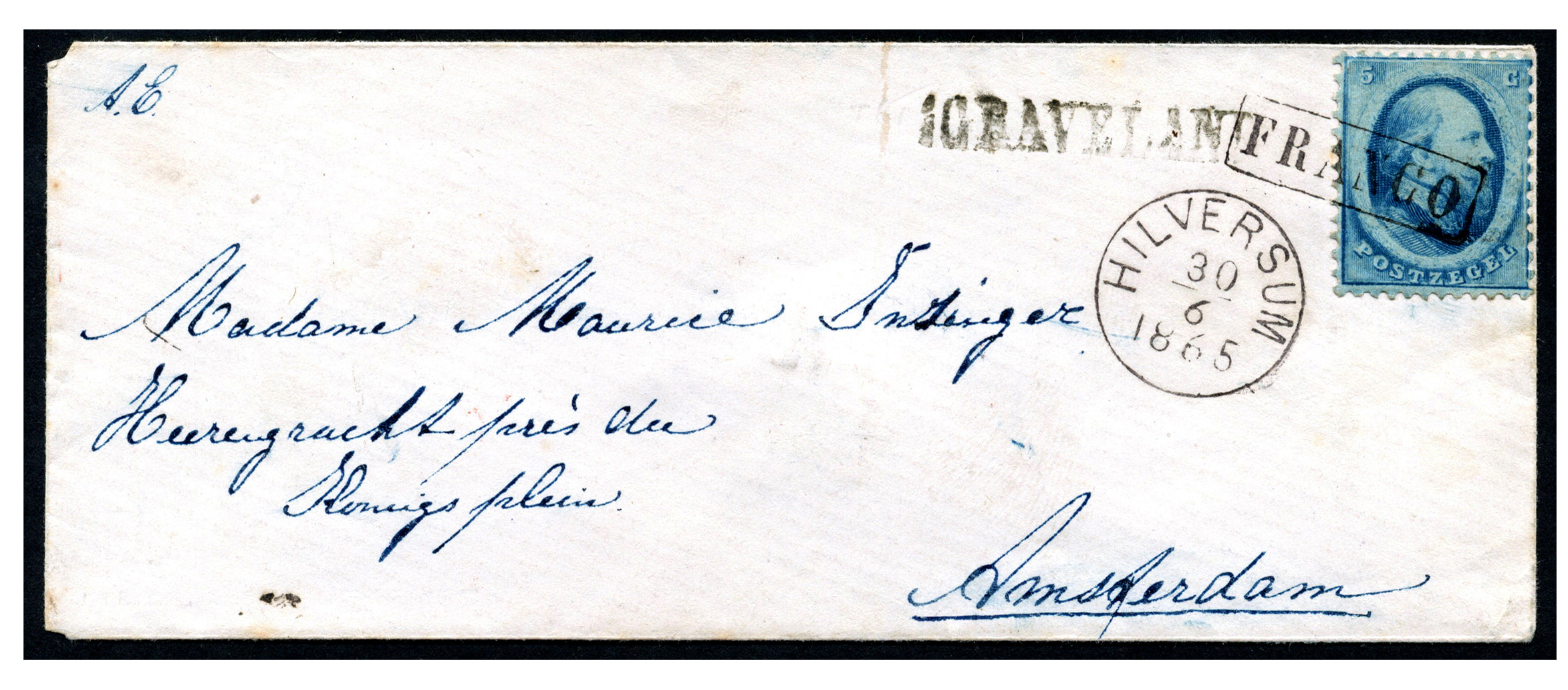 Proefstempel klein model Hilversum PEP1.6140-06 in zwart. 5 Cent nr. 4A op couvert van 'sGRAVELAND via Hilversum 30-6-1865 (superbe afst.) naar Amsterdam 1-7-1865, met bestellersstempel 48 in cirkel (Image)