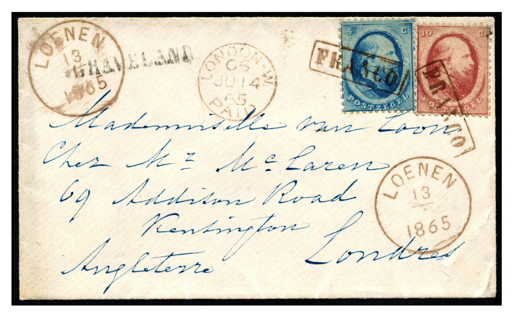 Buitenlandse bestemmingen. Groot-Brittannië. 5 Cent nr. 4AI en 10 cent nr. 5A, beide prachtex. op envelop van 'sGRAVELAND (in Noord-Holland, naamstempel in zwart) via Loenen 13-6-1865 (in Utrecht, rondstempel K.45 en Franco in kader in