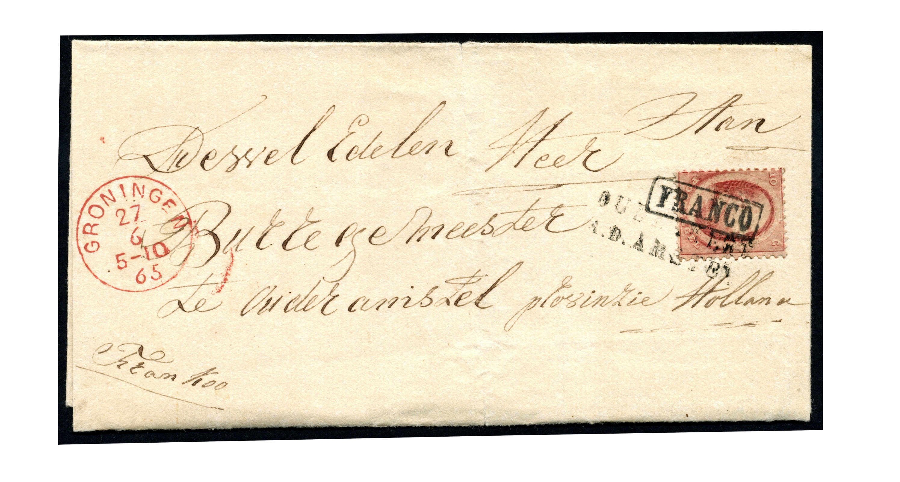 10 Cent nr. 5A op briefomslag van Groningen 27-6-1865 naar de burgemeester te Ouder Amstel, volgens inzender via OUDERKERK / A.D. AMSTEL, tweeregelig naamstempel met schreven, deels afgestempeld op de zegel, over Amsterdam 28-6-1865 naar