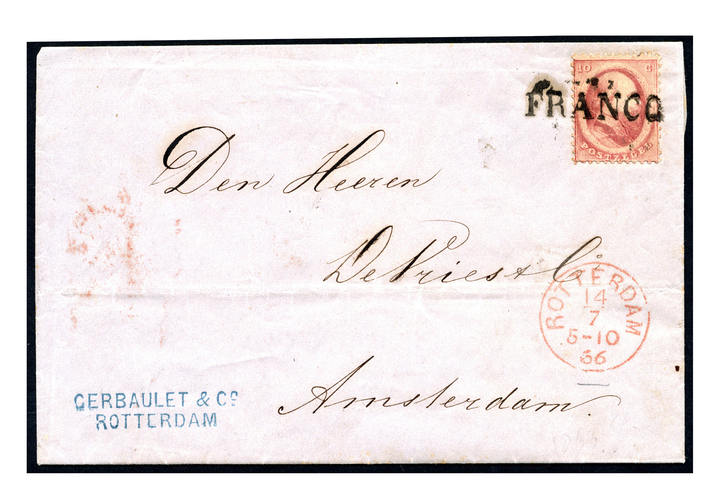 10 Cent nr. 5A, prachtex. op complete brief, afgestempeld met een groot model stempel FRANCO zonder kader, van Rotterdam 14-7-1866 naar Amsterdam 15-7-1866. Gedurende enkele weken in de maand juli 1866 is dit stempel in Rotterdam gebruikt