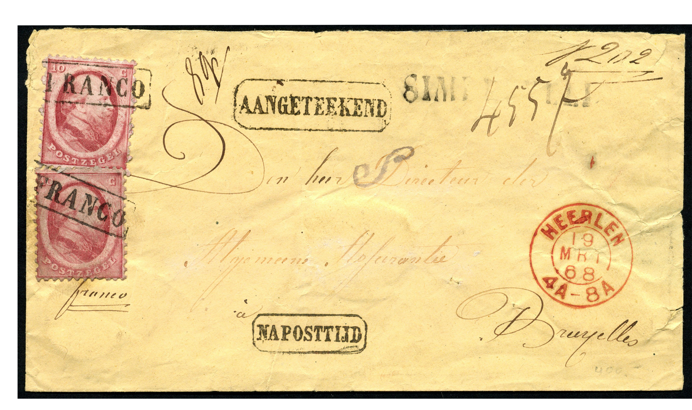 Buitenlandse bestemmingen. België. Twee zegels van 10 cent nr. 5B op gele envelop van 8 gram van SIMPELVELD (naamstempel rechtsboven) via Heerlen 19-3-1868 aangetekend en 'Na Posstijd' naar Brussel 2-3-1868 (Image)