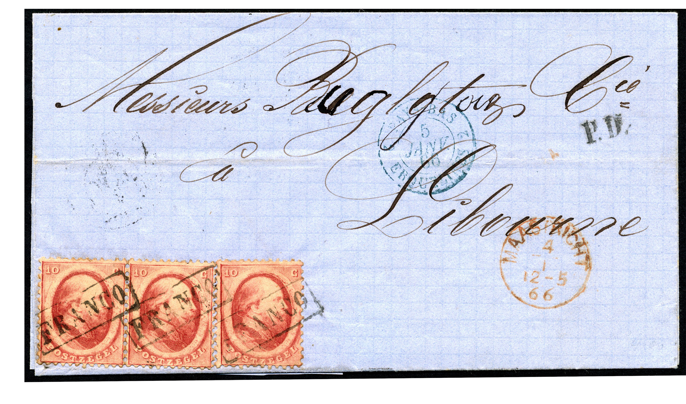 Buitenlandse bestemmingen. Frankrijk. 10 Cent nr. 5A in prachtpaar en los op briefomslag van Maastricht 4-1-1866 (klein type rondstempel K.49a) via grenskantoor Erquelines 5-1 over Parijs naar Libourne 6-1-1866 met op vz. klein type