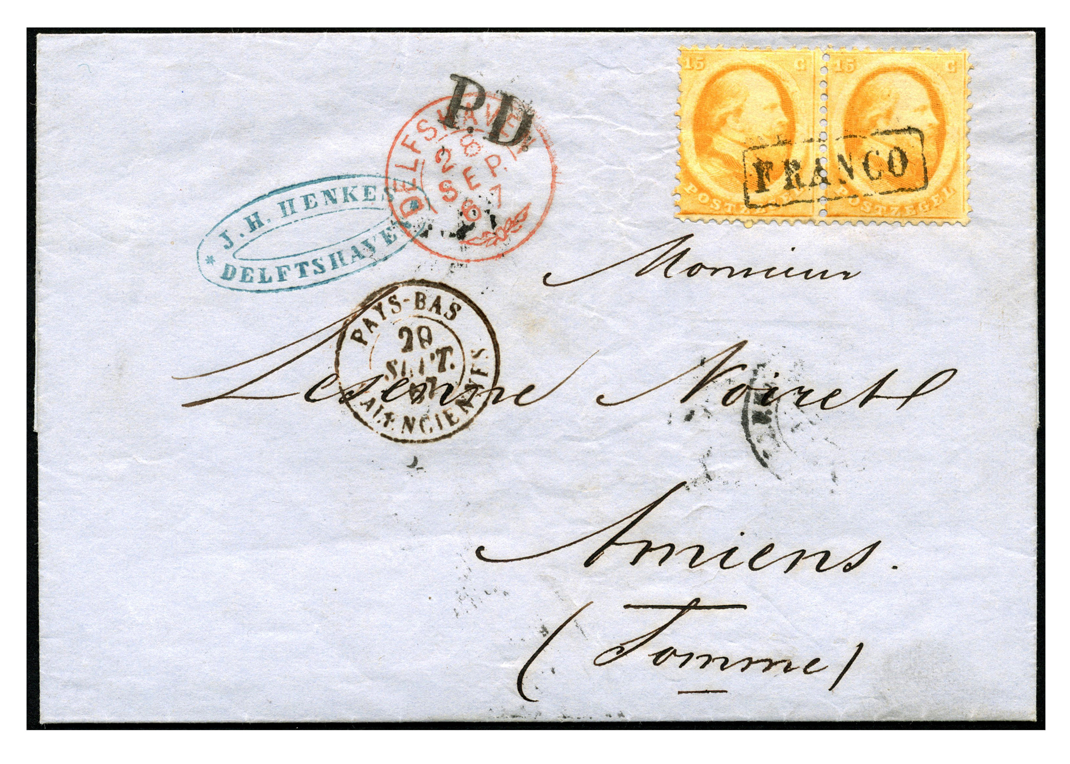 Buitenlandse bestemmingen. Frankrijk. 15 Cent nr. 6A in prachtpaar op zeer frisse brief van Delfshaven 28-9-1867 (takjestempel) via grenskantoor Erquelines 29-9 naar Amiens 30-9-1867 met op vz. 'P.D.' in zwart (Image)