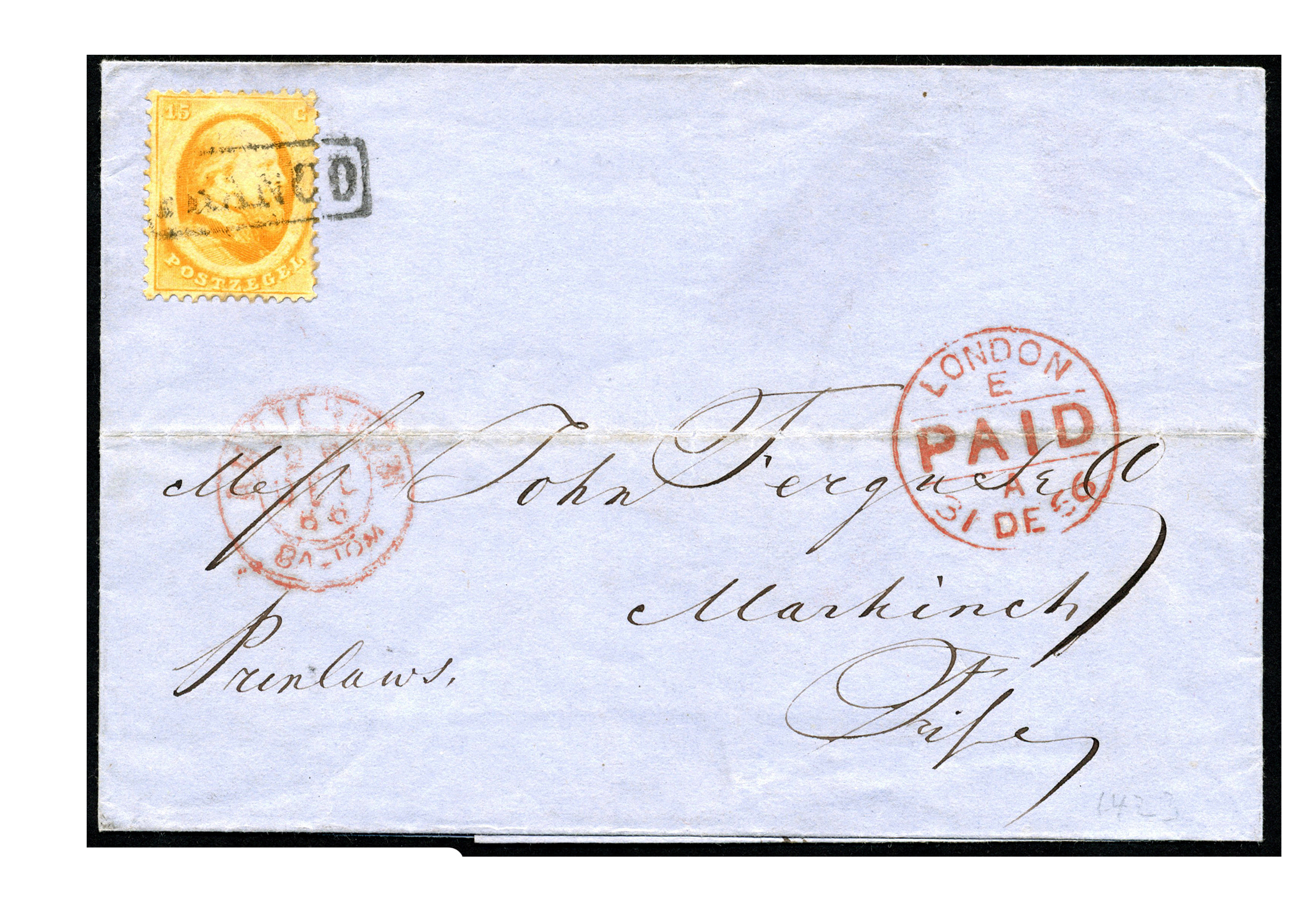 gefrankeerd met 40 cent aan zegels van de tweede emissie naar GB bekend! Vanaf 1-10-1864 werd het port radicaal verlaagd van 40 naar 15 cent. Zie: Van Hussen, p.235-237