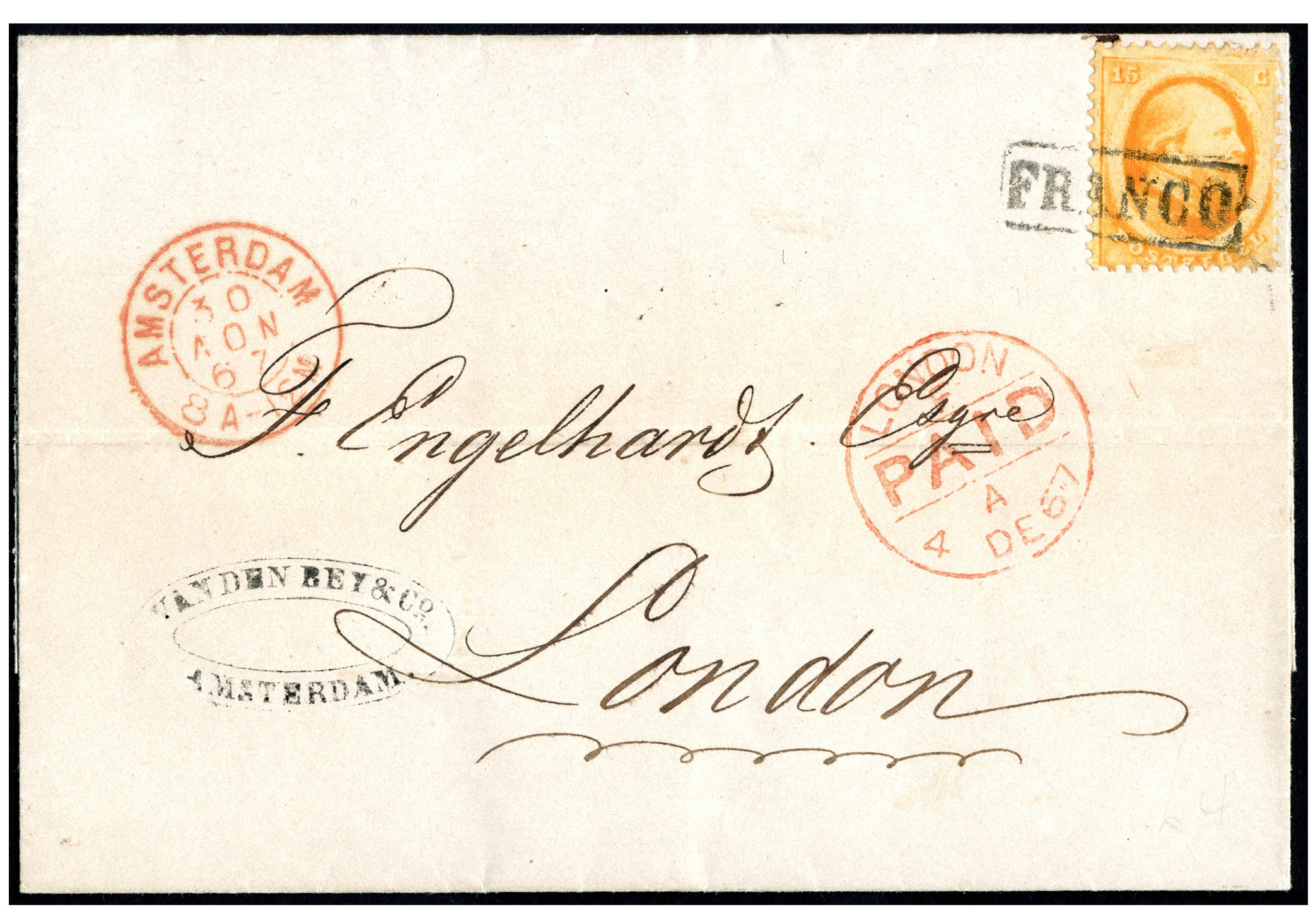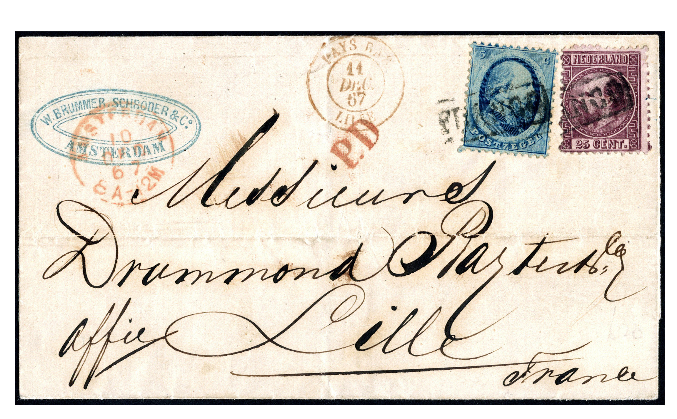 'P.D.' in rood. Het tarief naar Frankrijk, via België, is van 1-4-1852 tot 1-4-1868 30 cent per 7½ gram. Zie: Van Hussen, p.224. Zeer zeldzaam en spectaculair tentoonstellingsstuk! Slechts enkele poststukken met deze combinatie bekend, waarvan deze