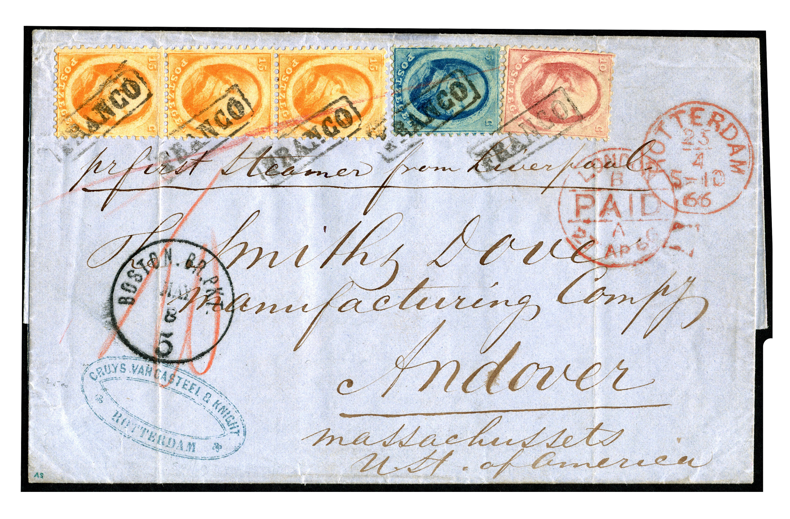 Rotterdam 25-4-1866 via Londen 27-4 'pr first Steamer from Liverpool' over Boston 8-5 naar Andover. Over de zegels een rode potloodstreep, de rode '/ 10' duidt volgens het bijgaande certificaat op het Engelse deel van het port (10 pence), 5 cent