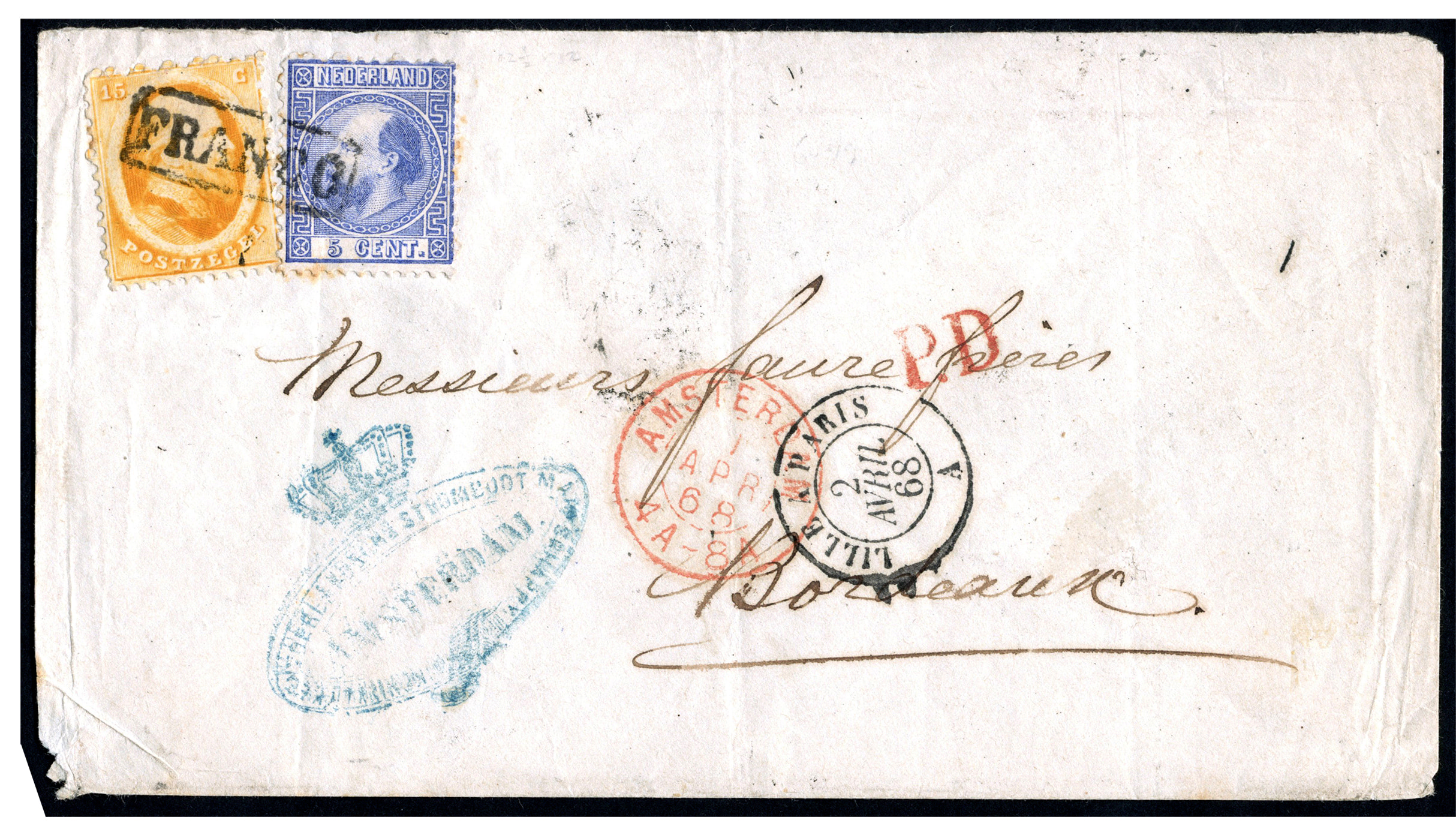 Paris 2-4 en Paris á Bordeaux 3-4 naar Bordeaux 4-4-1868. Blauw afz. stempel en op az. preegdruk van de KNSM. Op 1-4-1868 is het briefport verlaagd van 30 naar 20 cent. Attest Vleeming (2016) met opmerking: 'Mij geen 2e brief bekend met 1e dag nieuwe