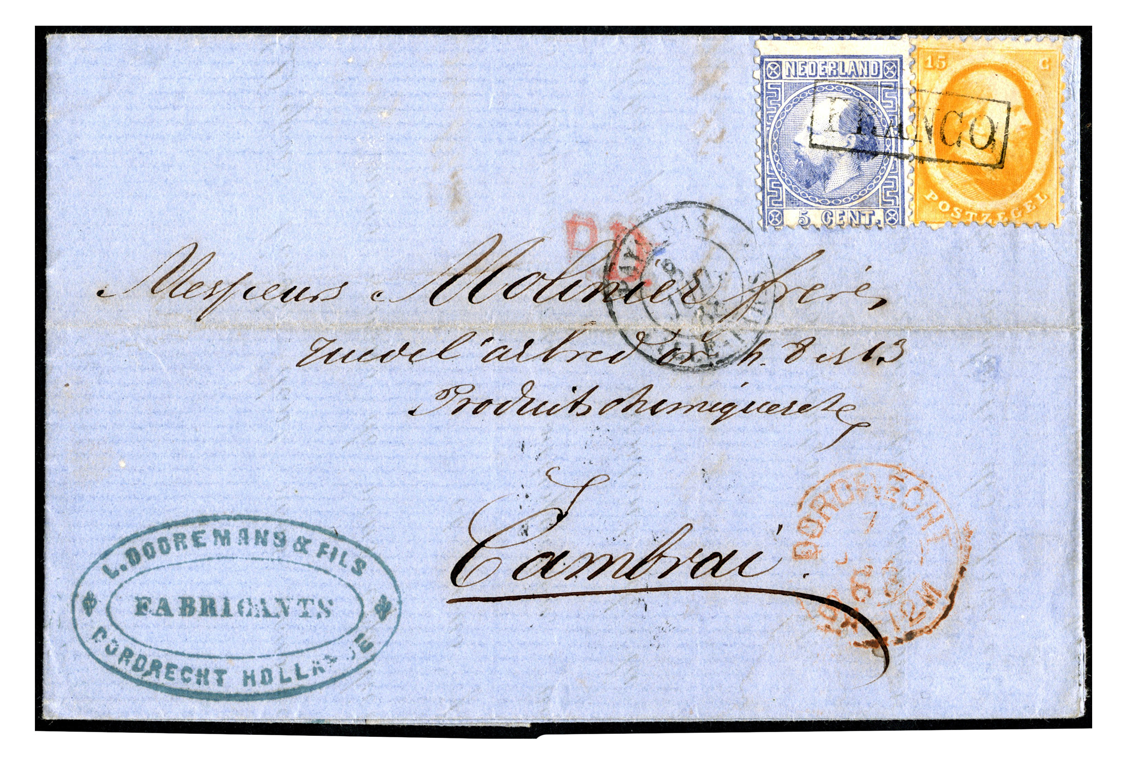 Mengfrankering emissies 1864 en 1867. 15 Cent nr. 6B (prachtex.) en 5 cent nr. 7IIA (prachtex.) afgestempeld met Franco in kader, op gedeeltelijk gedrukte brief vaan Dordrecht 7-7-1868 via Lille-Paris 8-7 naar Cambrai 9-7-1868. Op vz.