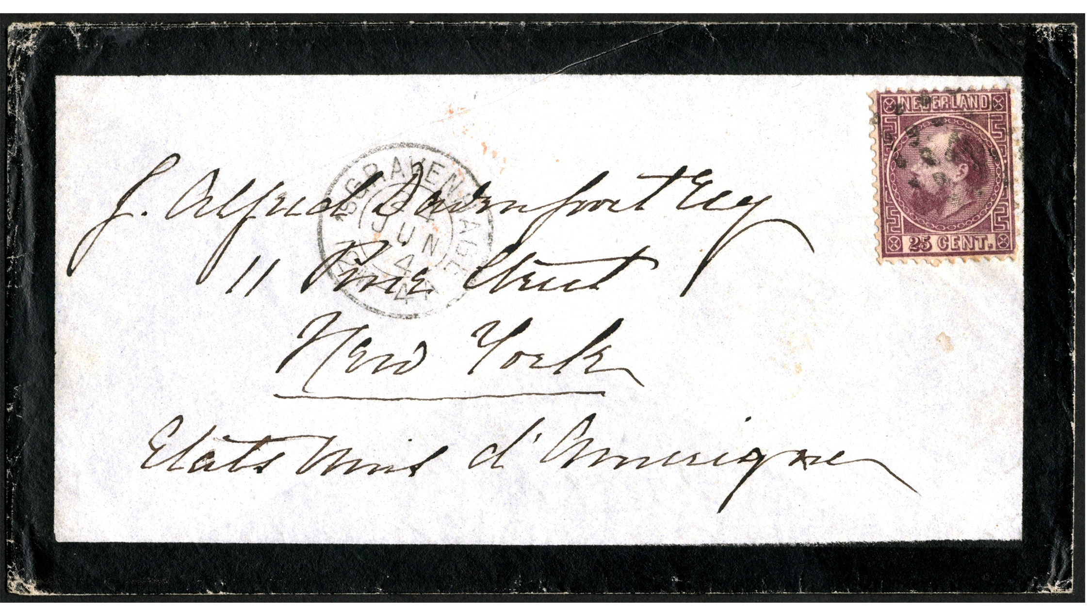 25 cent nr. 11IIA, prachtex. op rouwcouvert van 'sGravenhage 24-6-1874 naar New York 6-7 met op az. mooi ovaal afzenderstempel 'Hotel Belle Vue à La Haye / C.J. van Velsen' (Image)