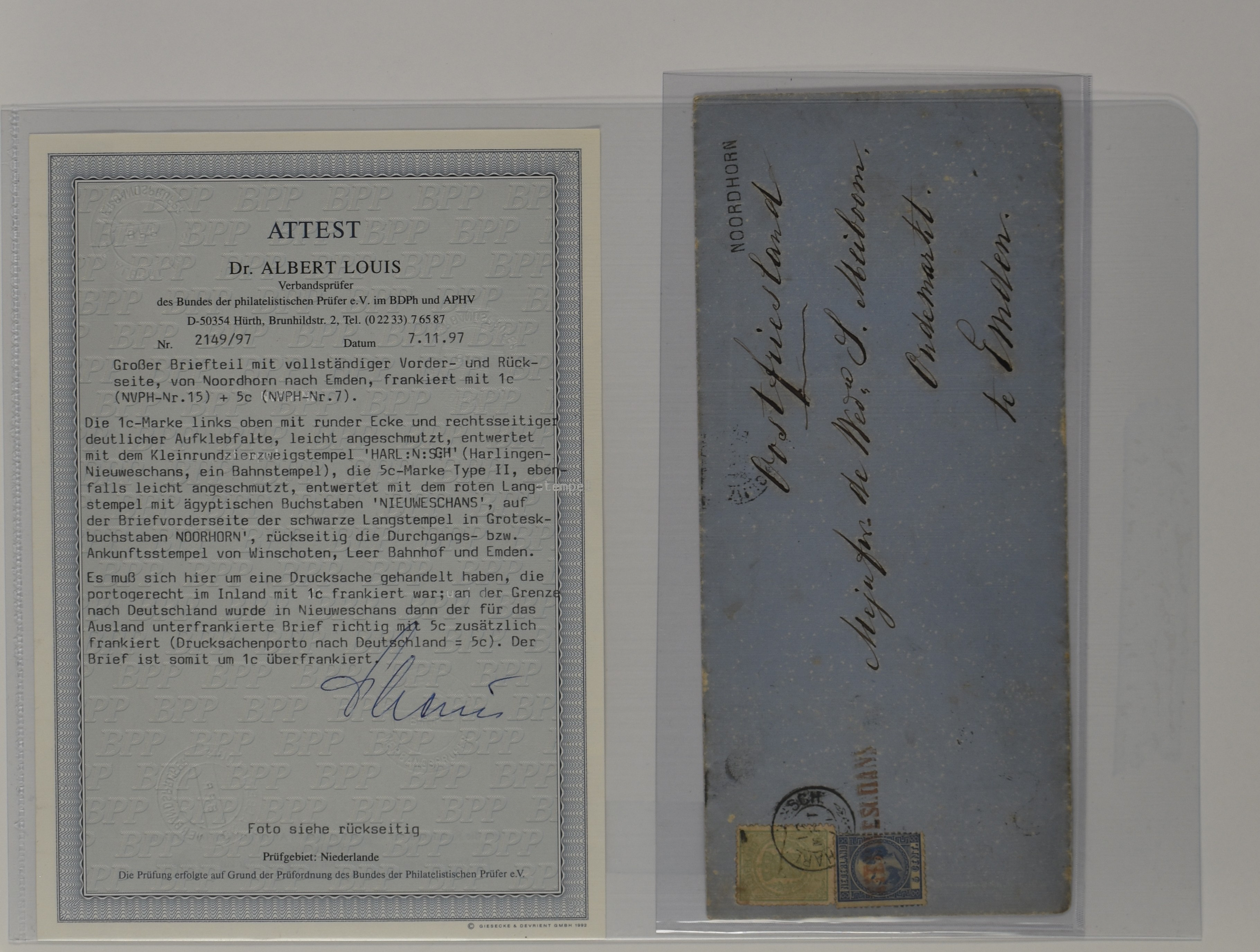Cent nr. 7IIC (prachtex.) en 1 cent groen nr. 15 (fraai), afgest. takjestempel Harl:-Winsch: 12-3-1871, de 5 cent met rood naamstempel NIEUWESCHANS met schreven, op wat minder frisse drukwerkomslag van Noordhorn (zwart naamstempel) over Winschoten