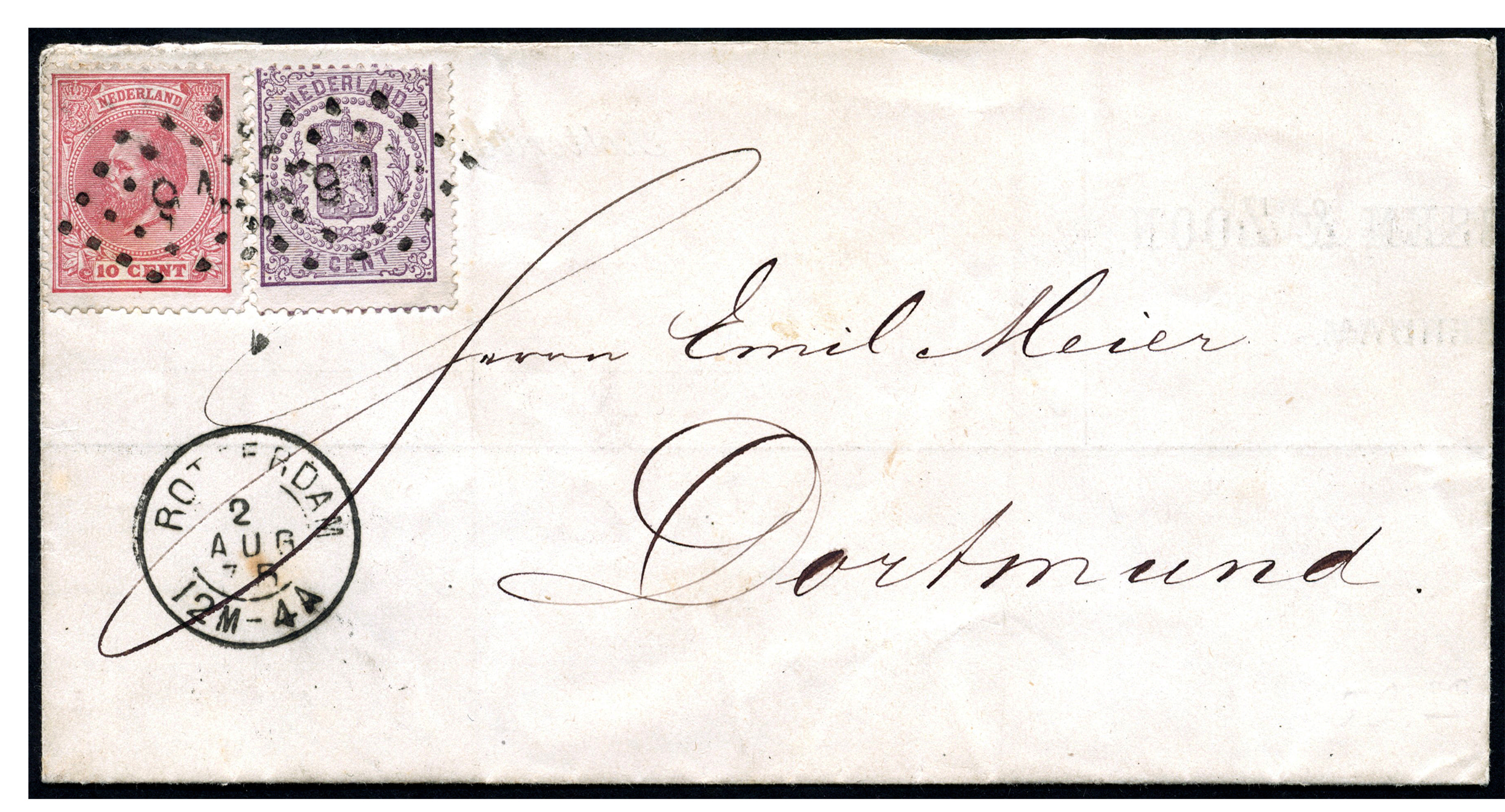 2½ cent nr. 18Da en 10 cent nr. 21H, twee prachtex. op deels gedrukte firma-brief van Rotterdam 2-8-1875 naar Dortmund 2-8. Een mooie mengfrankering!
