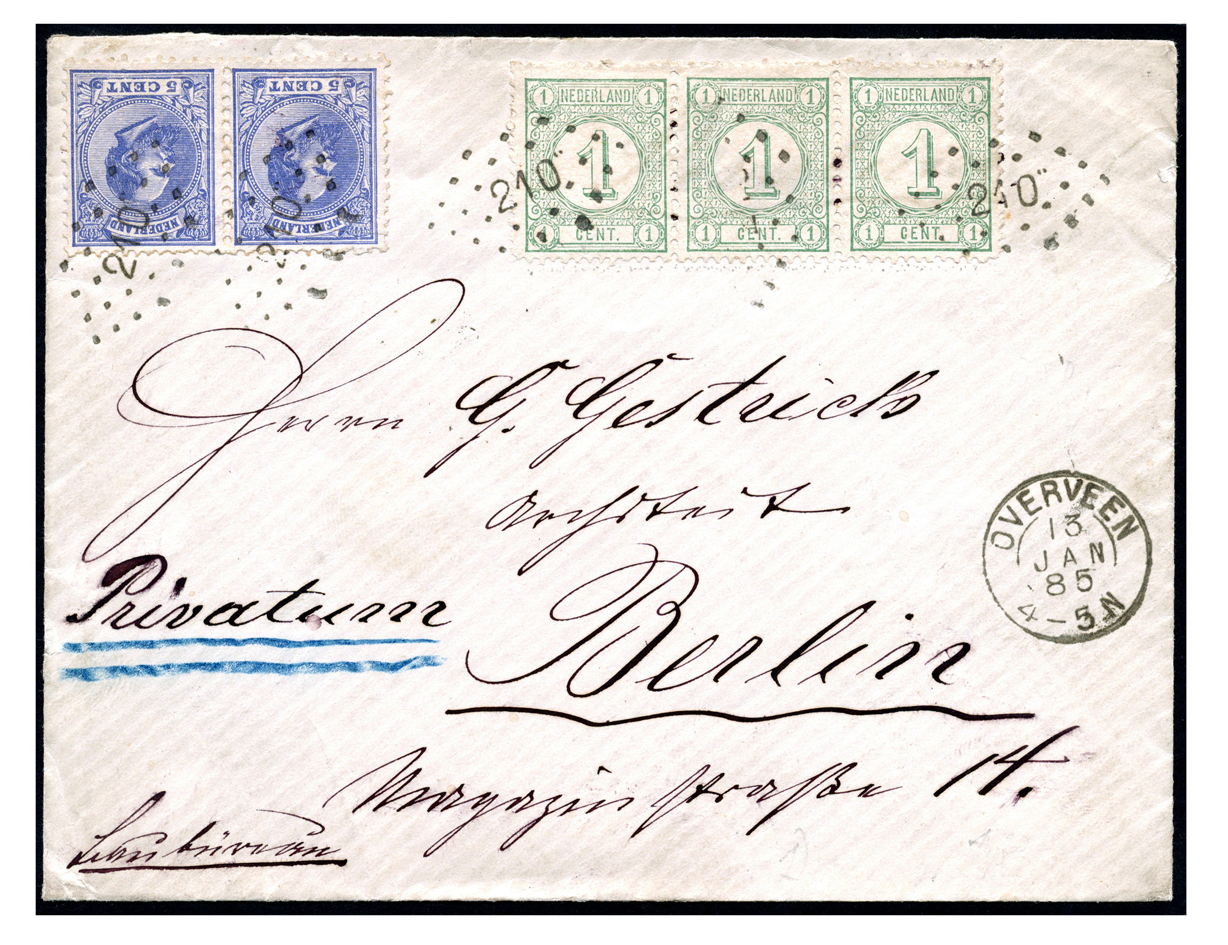 Cent nr. 31 in strip van drie en 5 cent nr. 19 in paar op envelop van Overveen 13-1-1885 naar Berlijn 14-1. Mooi poststuk! (Image)