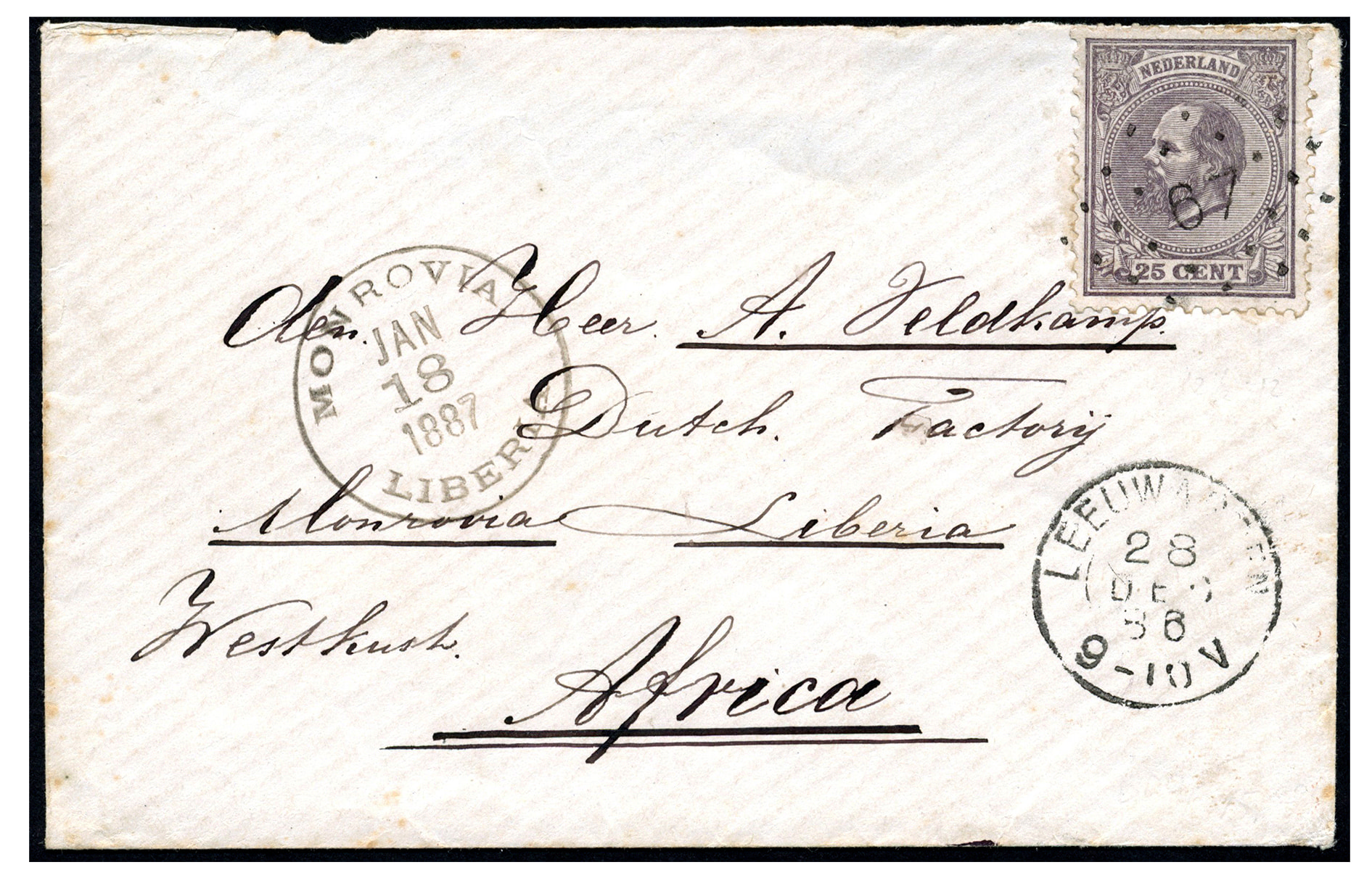 Liberia. Twee met 25 cent nr. 25 gefr. env. naar A. Veldkamp, Dutch Factorij en Consul of the Netherlands te Monrovia. Env. van Leeuwarden 28-12-1886 via Londen 30-12 naar Monrovia 18-1-1887, en env. van Amsterdam 27-4-1887 via Londen en