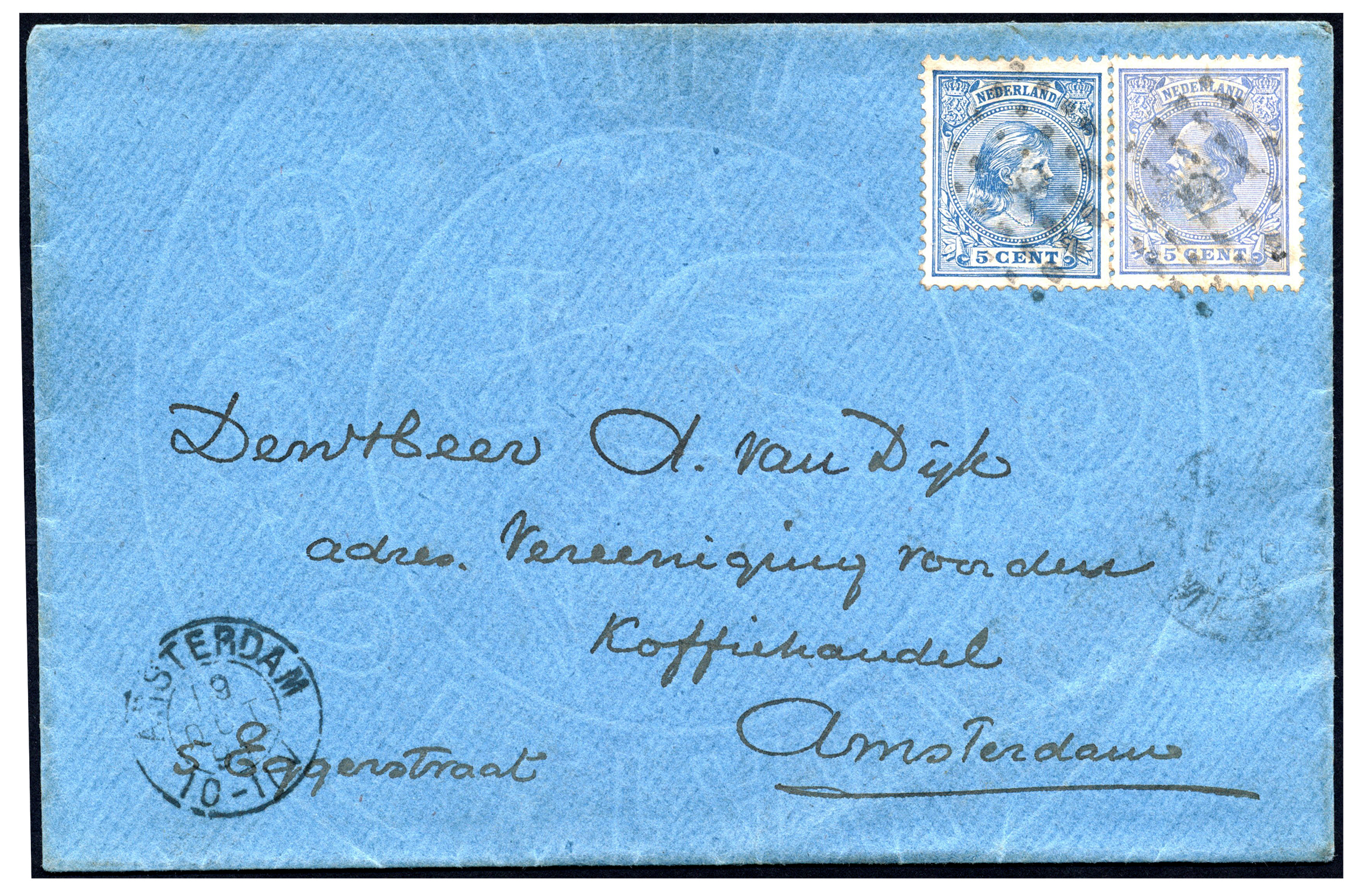 Mengfrankering. Env. gewichtsklasse 15-100 gram gefr. met 5c Willem III en 5c Hangend Haar ('vader' kijkt dochter aan) lokaal verz. te Amsterdam 19-10-1891