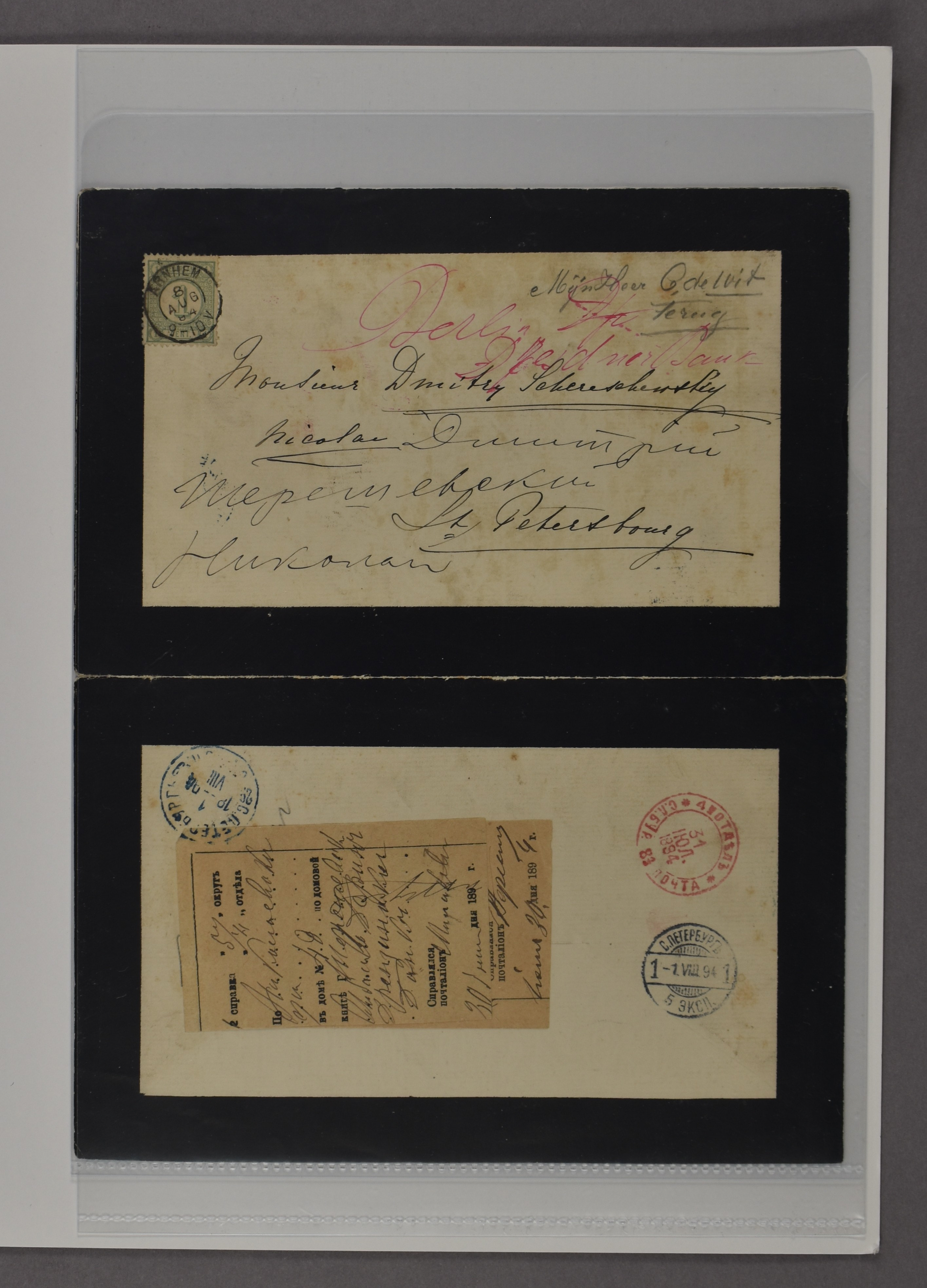 Rouwpost. 1 Cent nr. 31 op gedrukt rouwcouvert (aan 3 zijden geopend i.v.m. stempels en strook) van Arnhem 8-8-1894 naar St. Petersburg, geadresseerde niet thuis/bereikbaar, diverse stempels van St. Petersburg in zwart, blauw, groen en