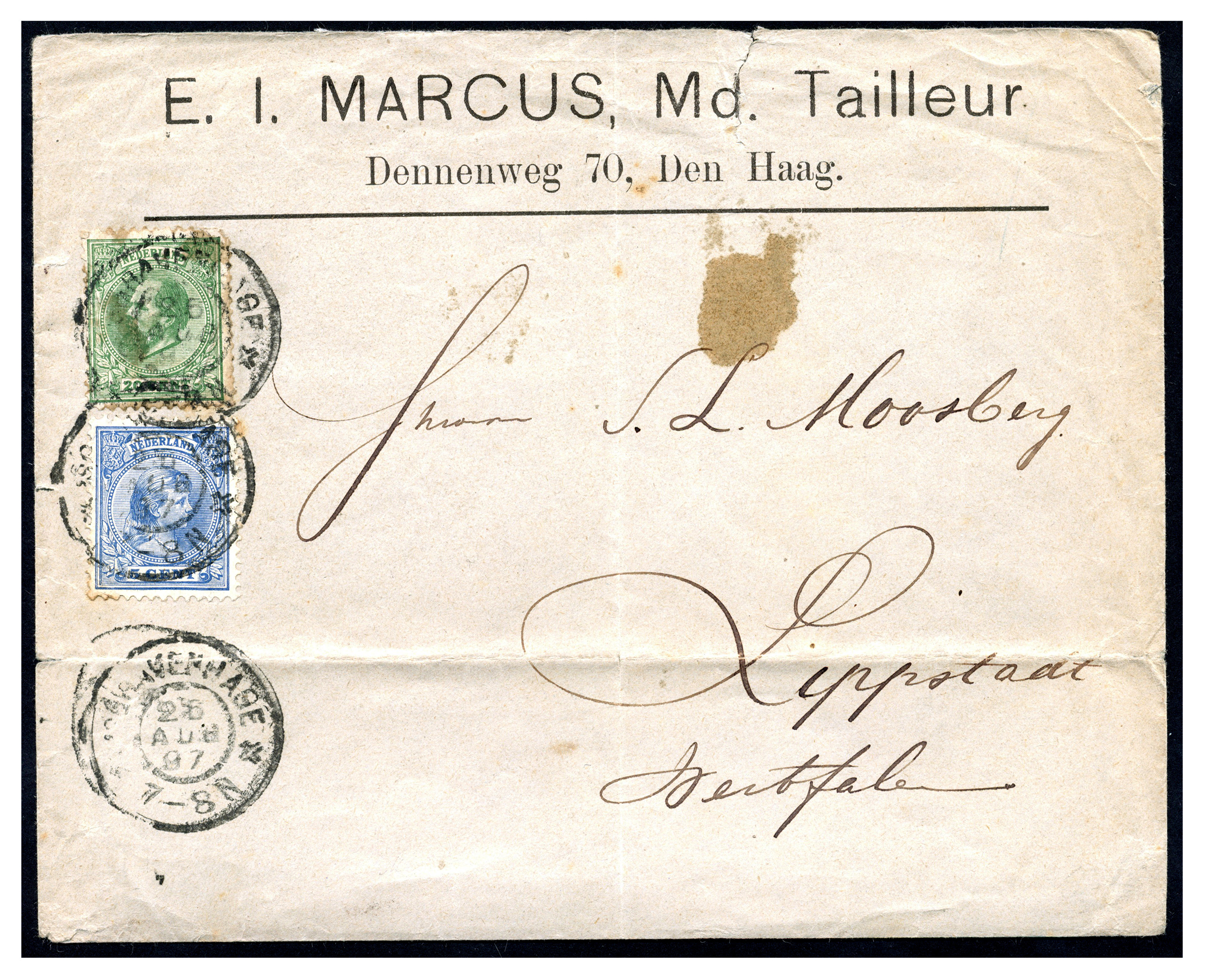 Mengfrankering. 20 Cent nr. 24 (fraai) en 5 cent nr. 35 (zeer fraai) op minder mooie firma-envelop van de 2e gew. klasse, van 'sGravenhage 26-8-1897 naar Lippstadt 27-8. Interessante mengfrankering, afgestempeld met grootrond, op nr. 24
