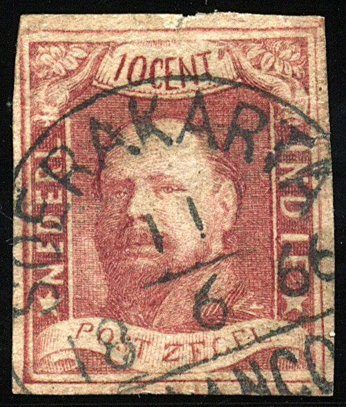 1685 o imageGrootrond SANGASANGADALEM met datum 10-4-1915 op 10 cent. Prachtex. met vrijwel volledige afdruk van dit uiterst zeldzame stempel. Tot nu toe slechts 2 andere afst. bekend, allebei uit 1915, 1 op prentbk. en 1 minder volledige op 20c Veth. Grote stempelrariteit! (Image)