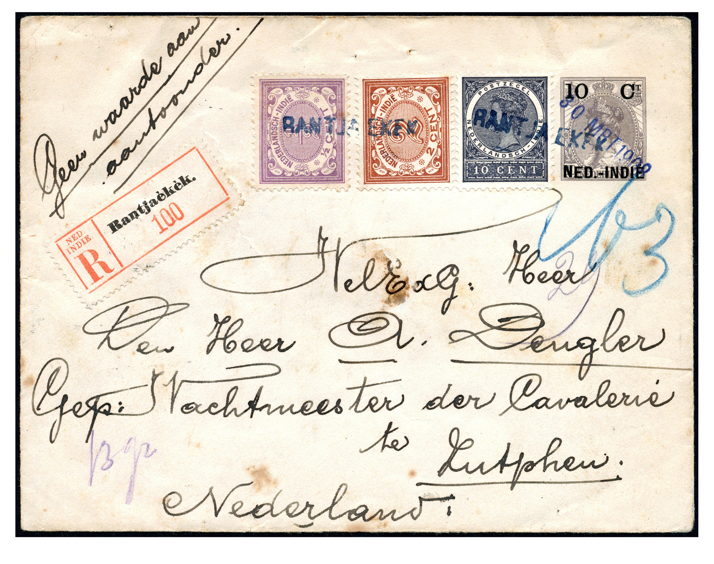 1700 on cover imageNaamstempel RANTJA EKEK in blauw op env. G14 bijgefr. met ½, 2 en 10 cent, van 13 gram, aangetekend op 30-3-1908 via Weltevreden 30-3 naar Zutphen 26-4-1908. Op de zegelindruk is een datumstempeltje 30 MRT 1908 in blauw afgestempeld, het R-strookje spelt de kantoornaam zoals het moet worden uitgesproken: Rantjaèkèk. (Image)