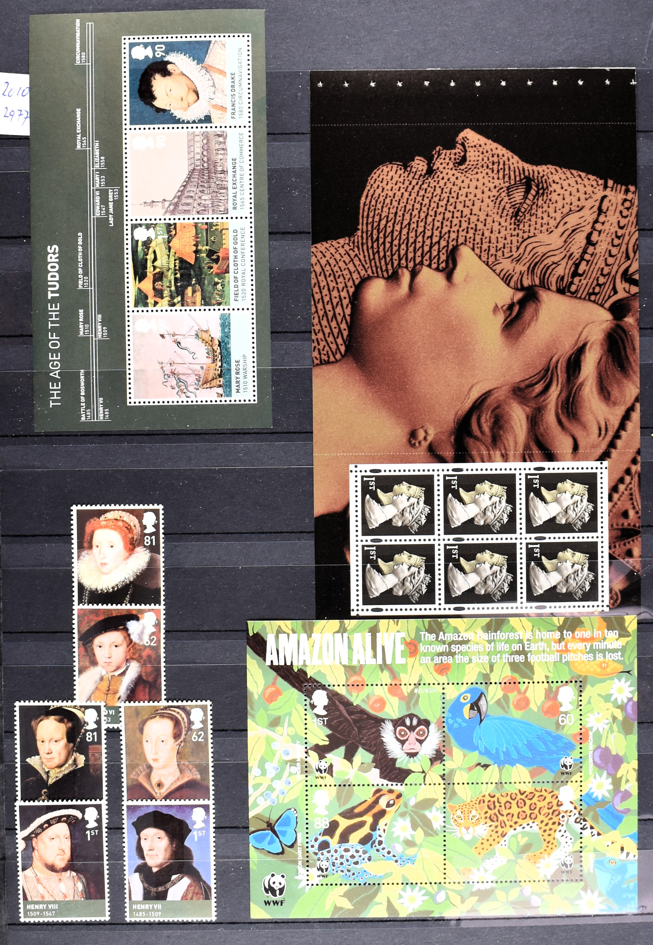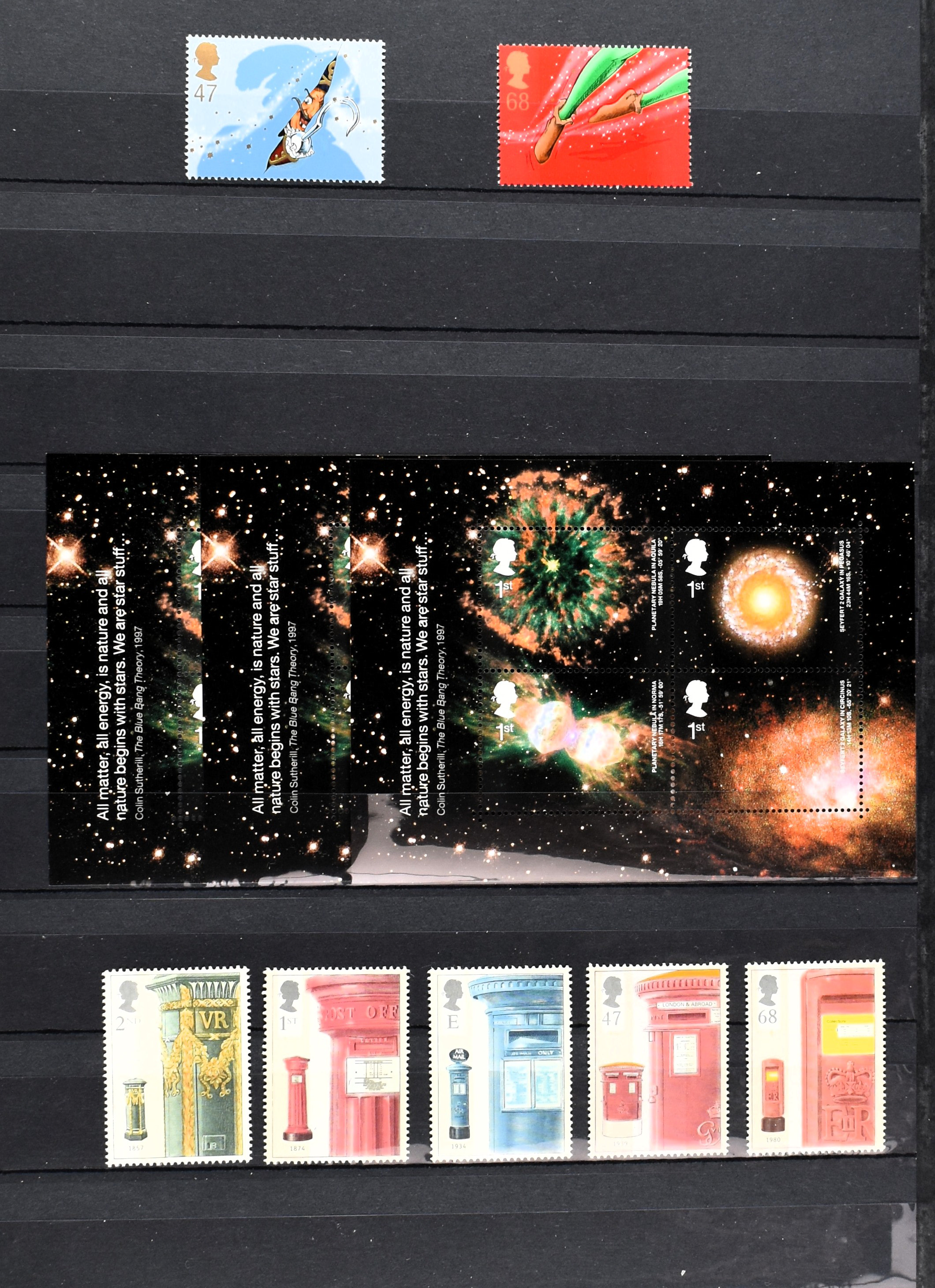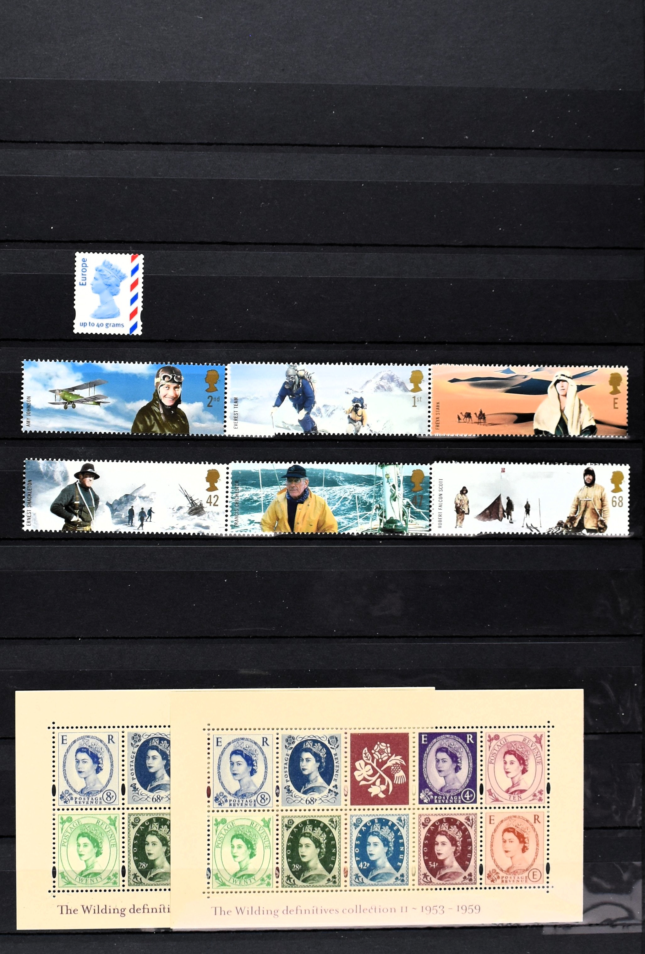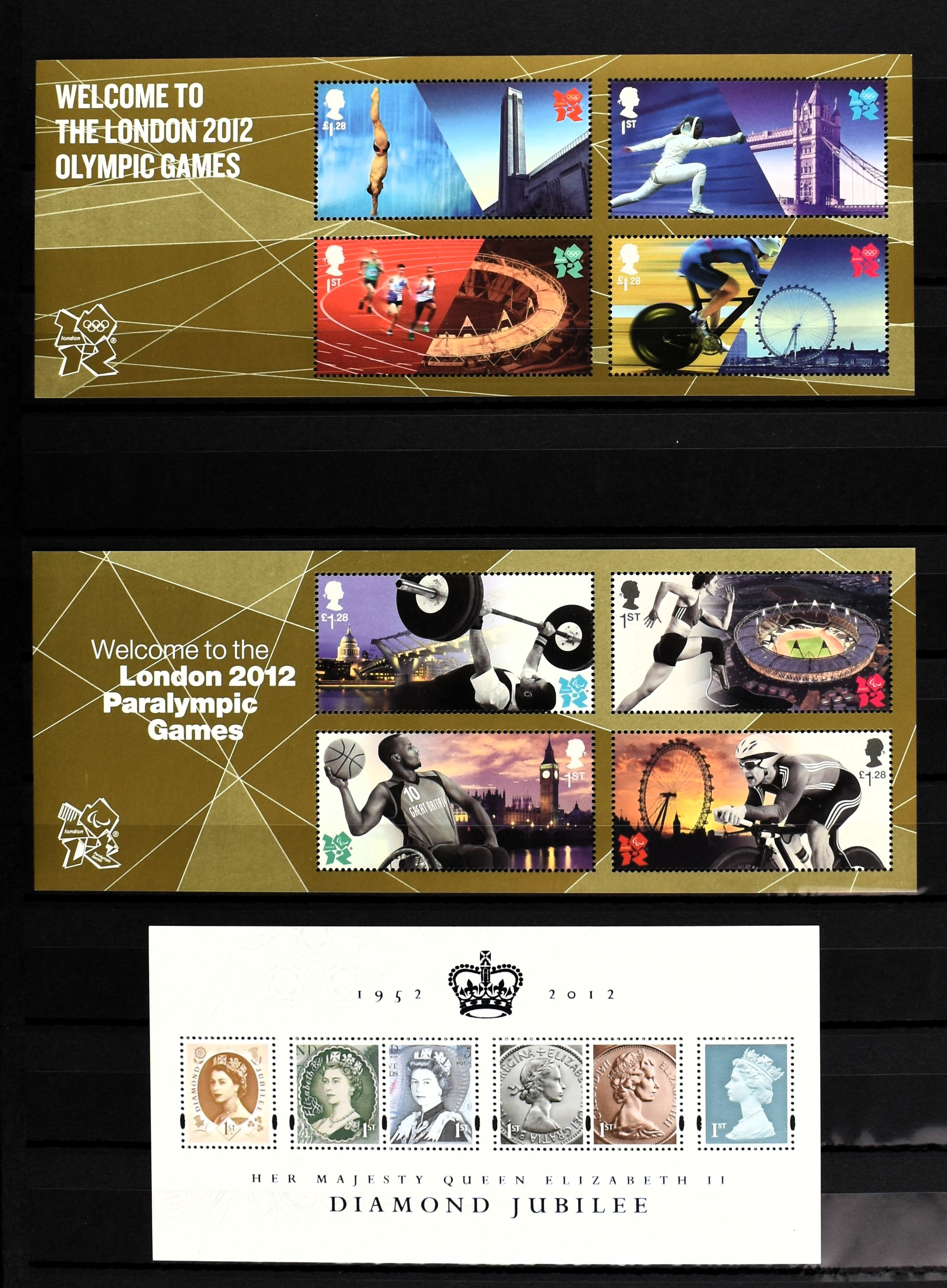 GREAT BRITAIN 1841-2012, o/*/** in 3 stock books and 1 shoe box with stamp-packs, containing £ 1153,- face value. As well as British Commonwealth in 3 stock books with better material and good thematics (Image) (Image2)