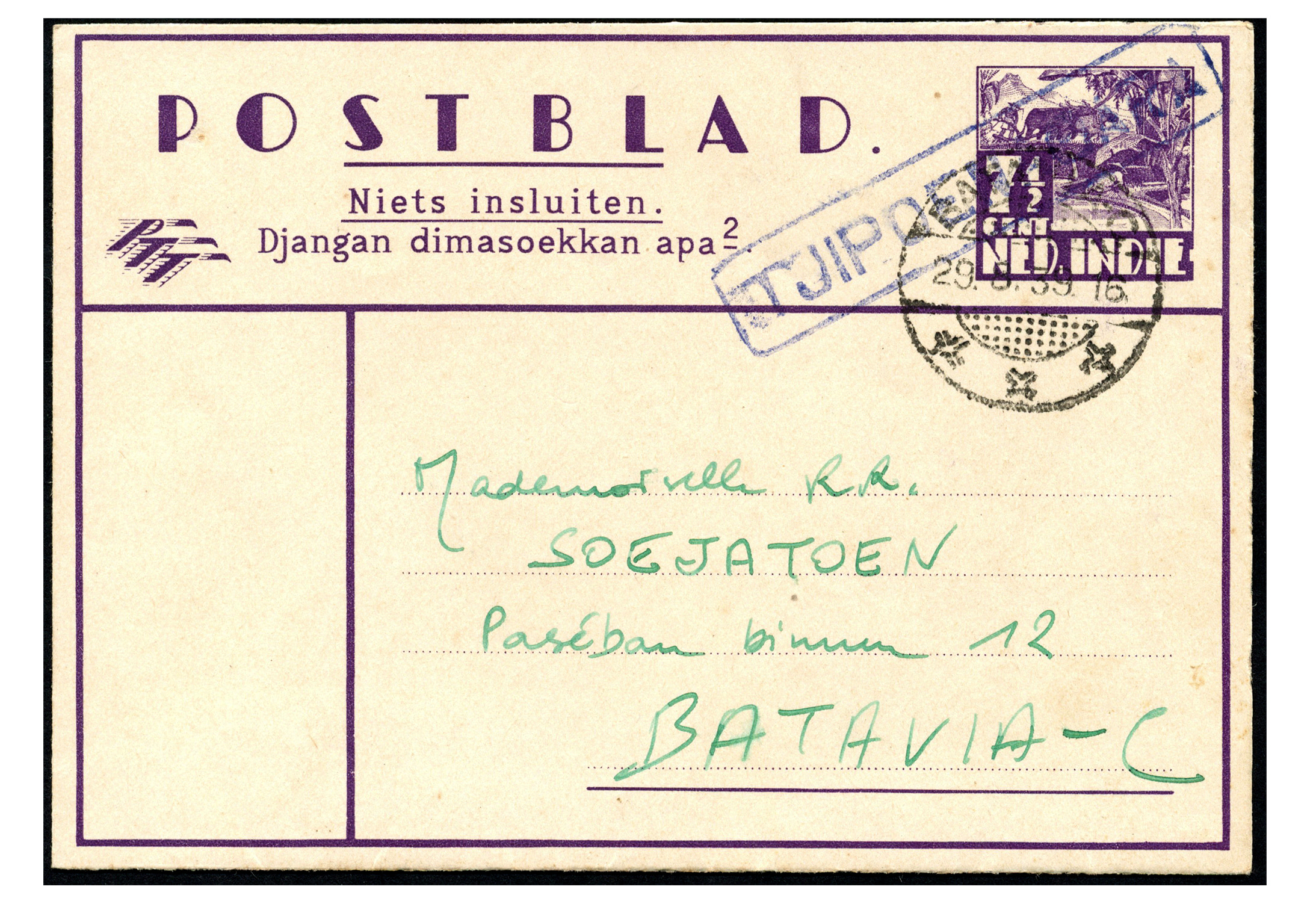 Haltestempel TJIPOENAGARA in blauw op pb. G4 naar Batavia-C. 29-8-1939 (Image)